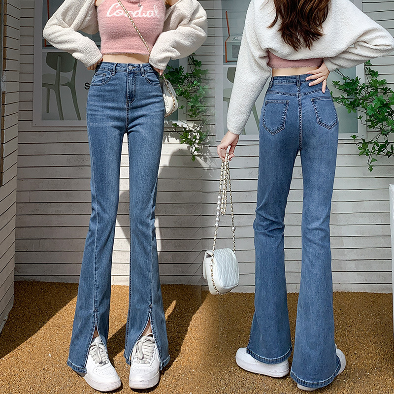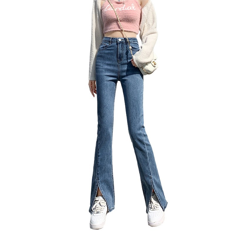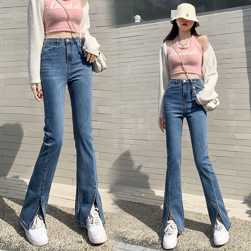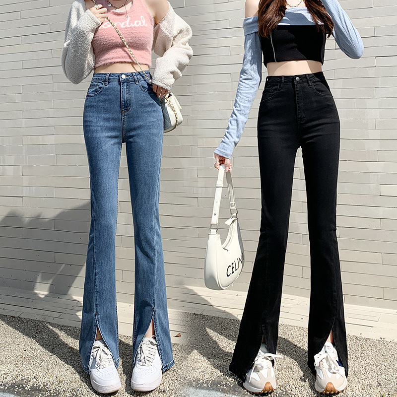 黑色开叉微喇牛仔裤女网红弹力修身马蹄小个子高腰百搭拖地喇叭裤