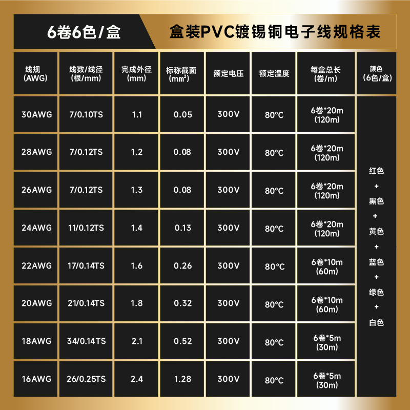 规格型号6卷/盒装PVC电子线-30AWG-6卷*20米-红黑黄蓝绿白