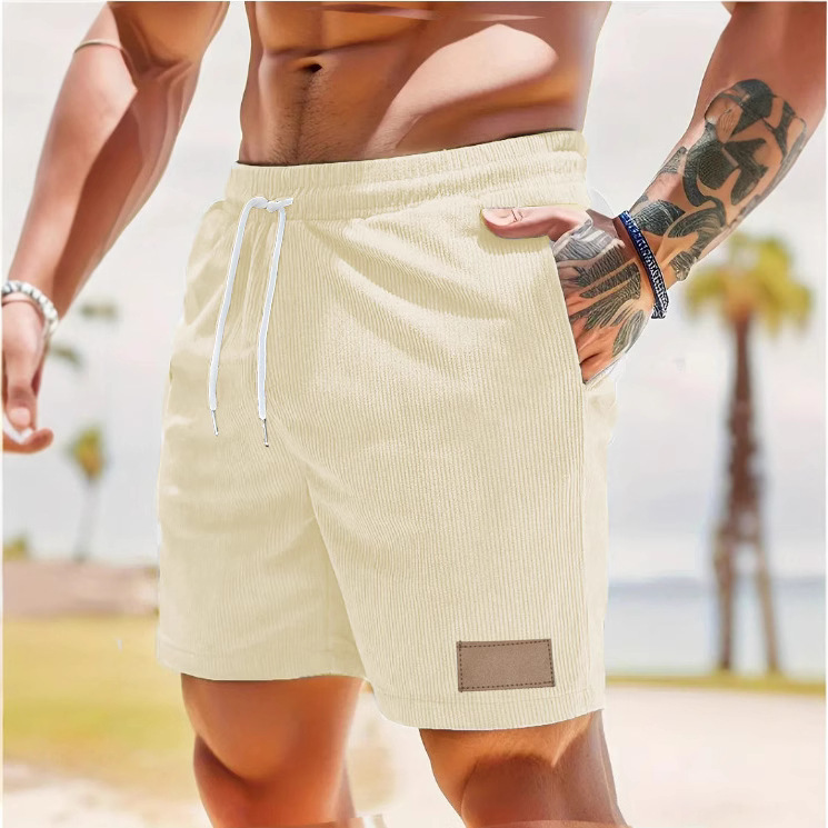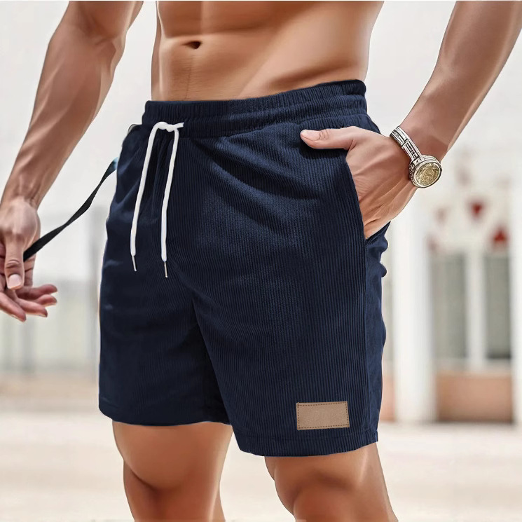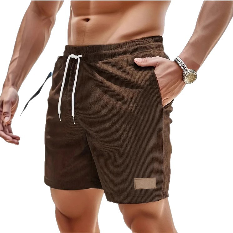 跨境2025男士短裤纯色系带运动裤灯芯绒简约五分短裤休闲裤 欧码