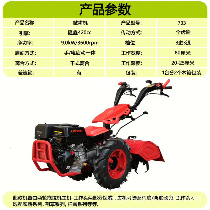 | 可配辅具 | 旋耕,开沟,犁土 | 适用场景 | 除雪扫树叶清理草坪松土开沟 |