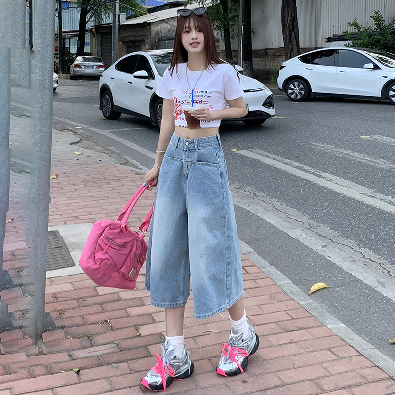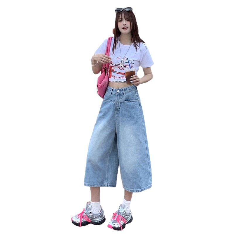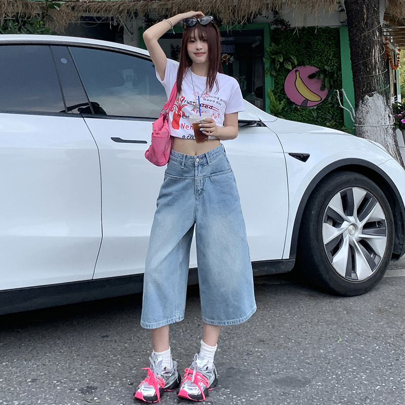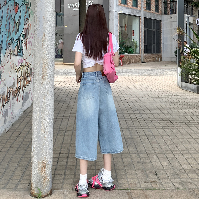 浅蓝色牛仔裤女七分裤夏季新款美式高腰宽松阔腿八分裤中裤