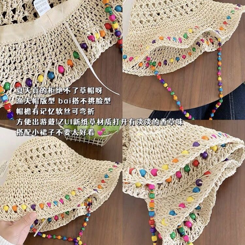 新款泫雅风彩珠渔夫帽夏季海边草帽女大帽檐遮阳防晒帽可折叠帽子