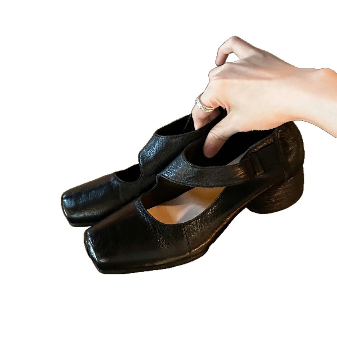 羊皮版~高级感真皮方头粗跟小皮鞋单鞋女芭蕾风中高跟玛丽珍瓢鞋