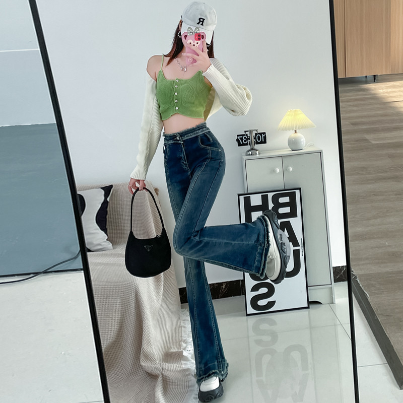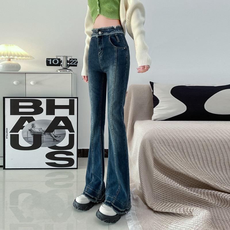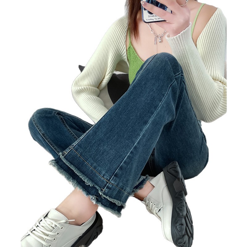 高腰微喇叭牛仔裤女2025年现货复古毛边显瘦马蹄裤九分长裤加长