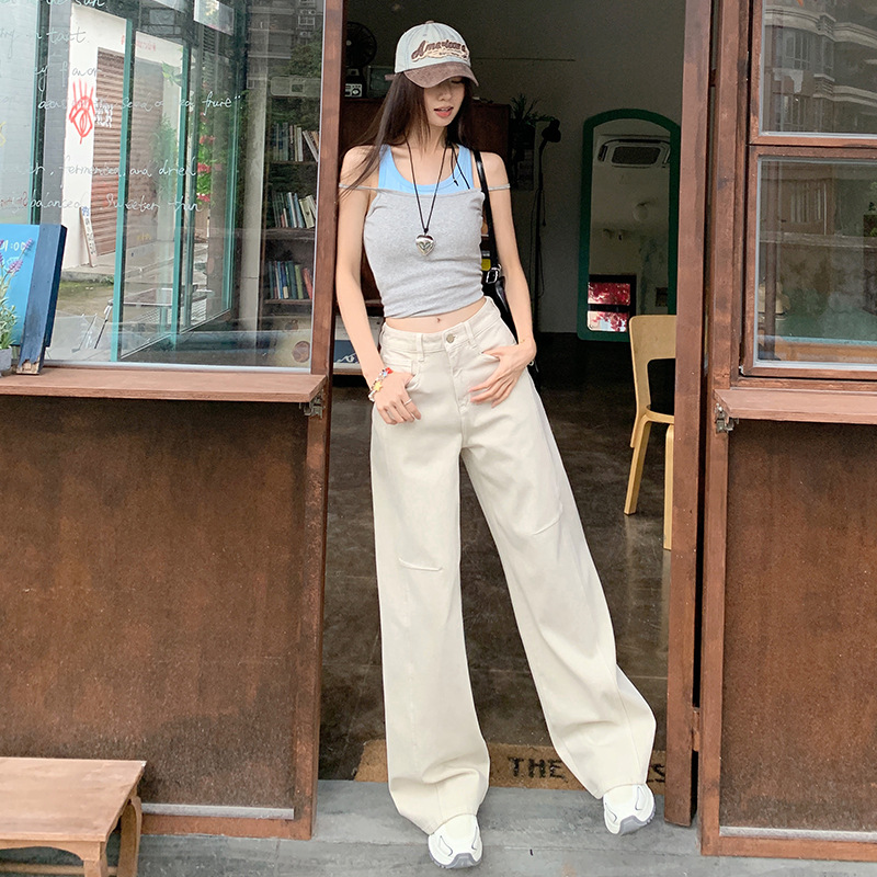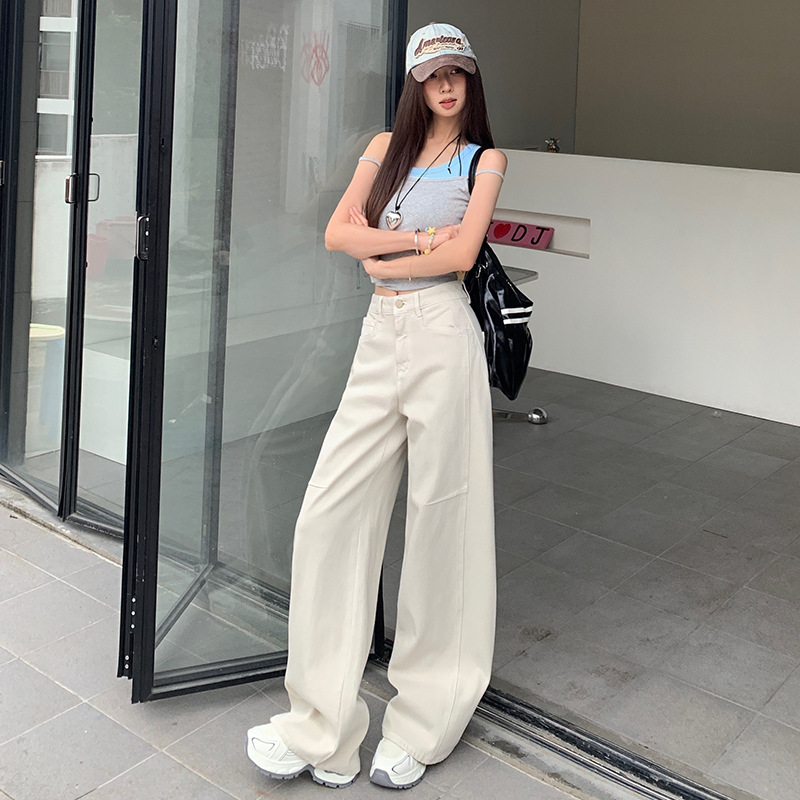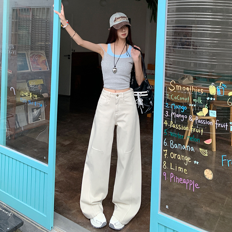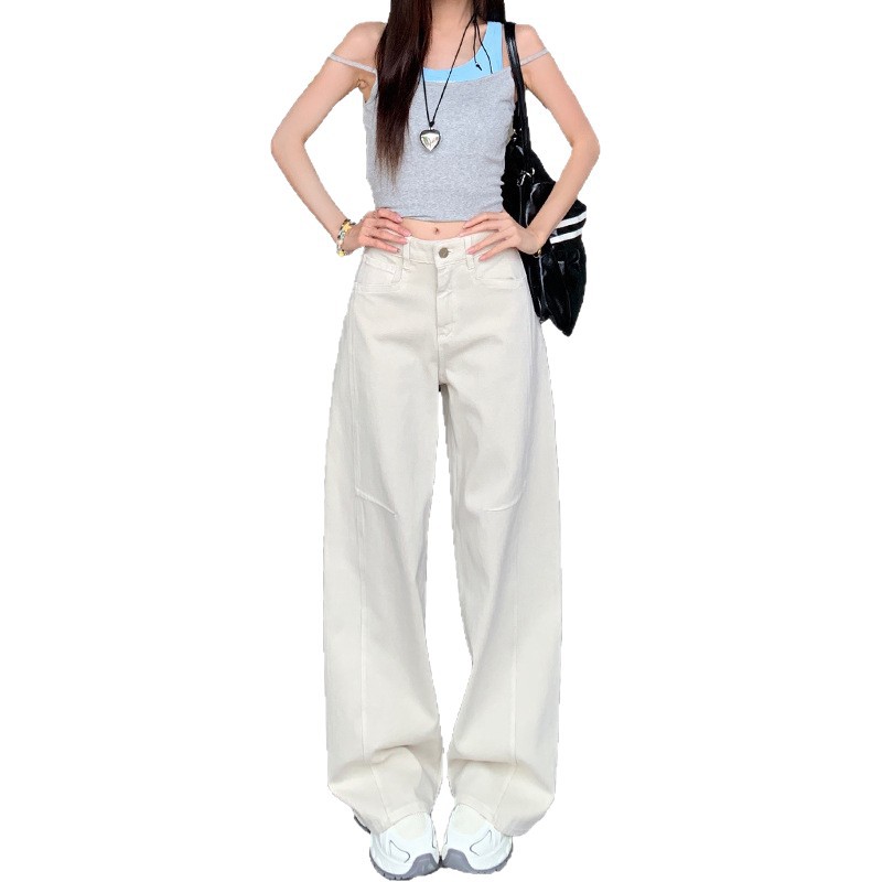 2025夏季新款美式杏色牛仔裤女设计感高腰阔腿直筒百搭显瘦牛仔裤