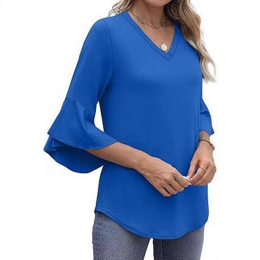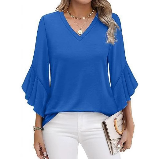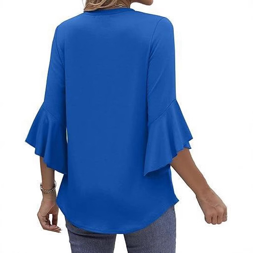 2025夏季欧美女装女式衬衫休闲3/4袖印花上衣女V领T恤喇叭袖衬衫