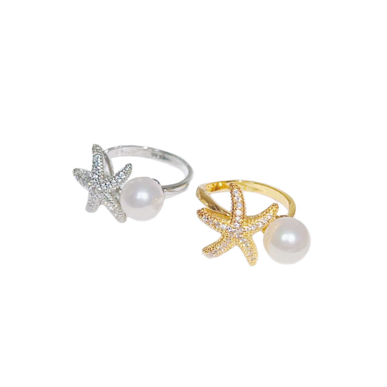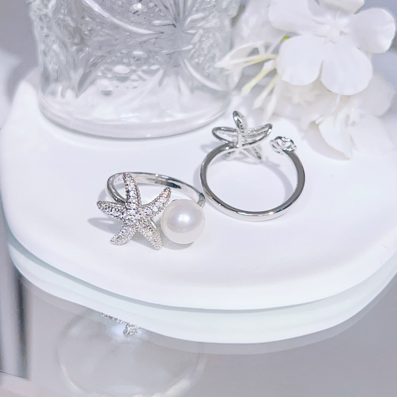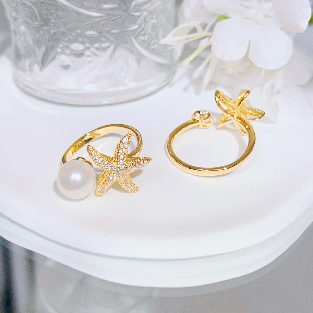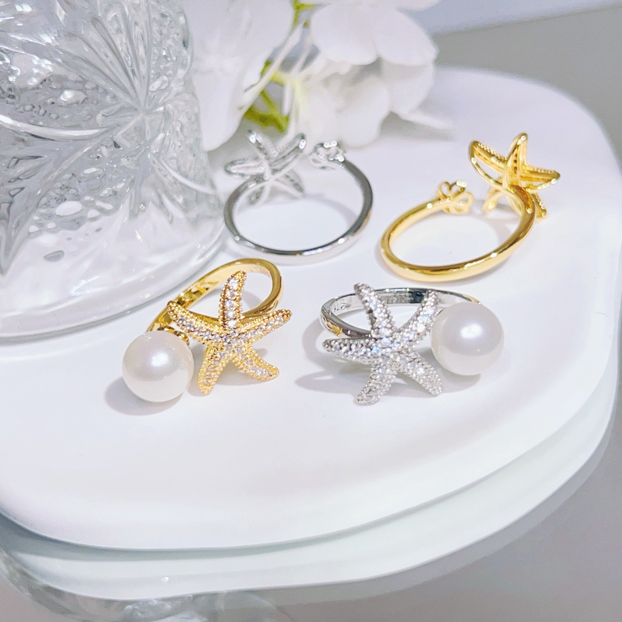 铜镀真金海星款微镶锆石珍珠戒指空托时尚潮搭戒指指环可调节女