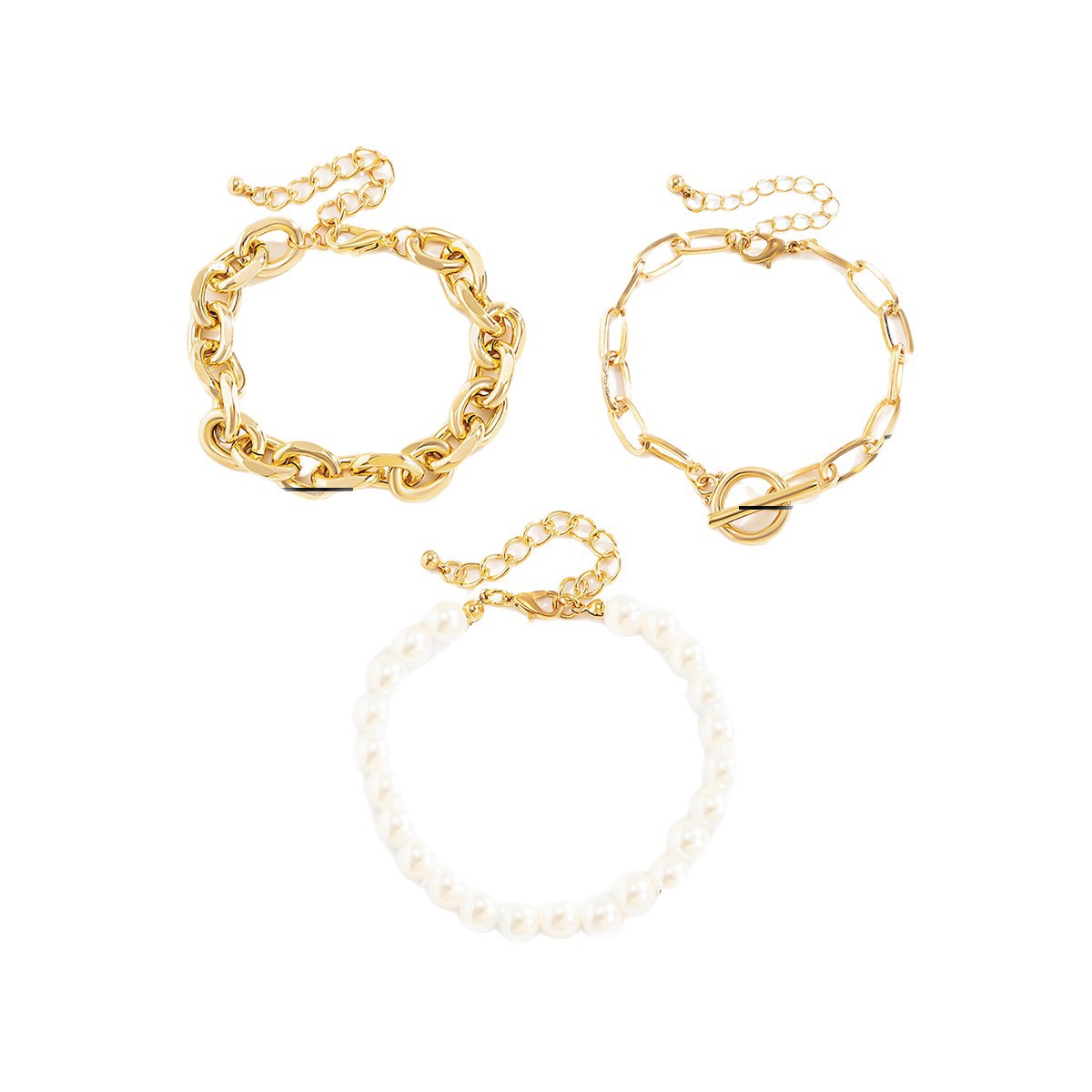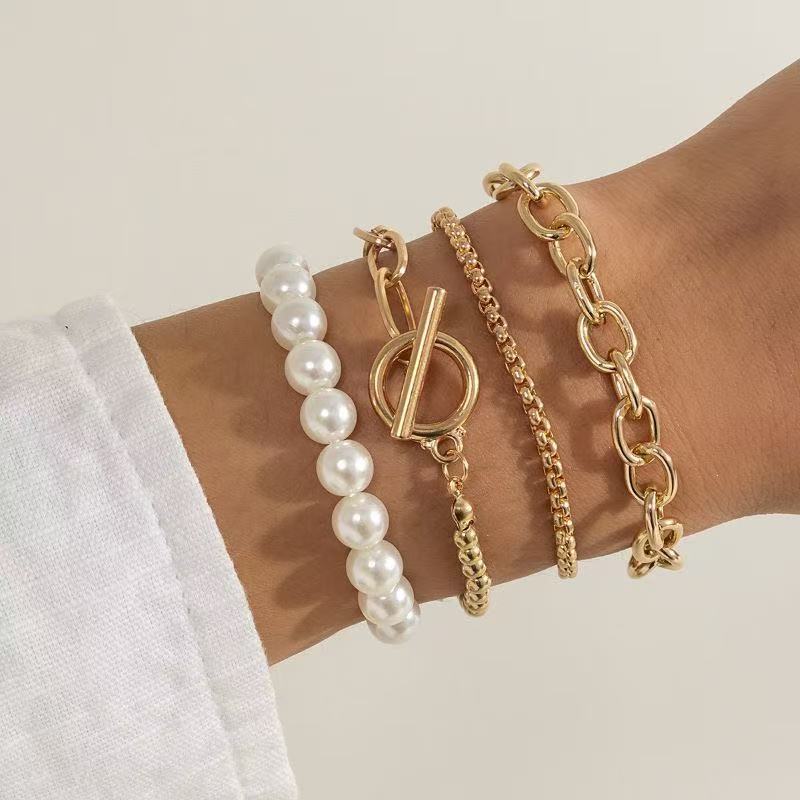 欧美跨境饰品 时尚巴洛克气质珍珠手链套装 金属链条OT扣混搭手饰