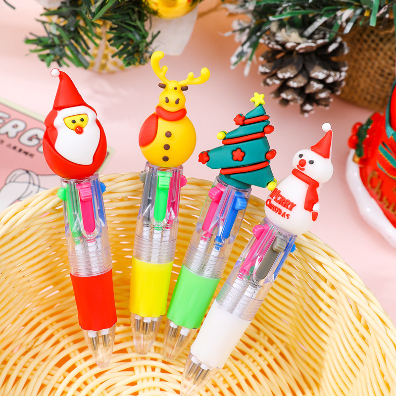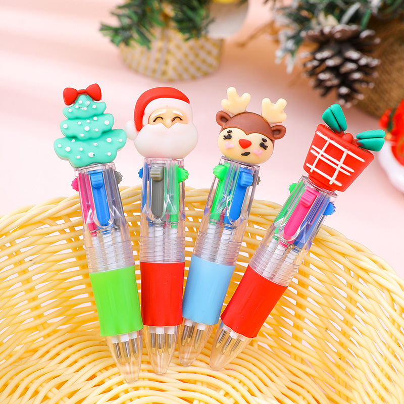 圣诞迷你四色圆珠笔卡通小鹿老人4色油笔手账彩色按动笔学生礼物