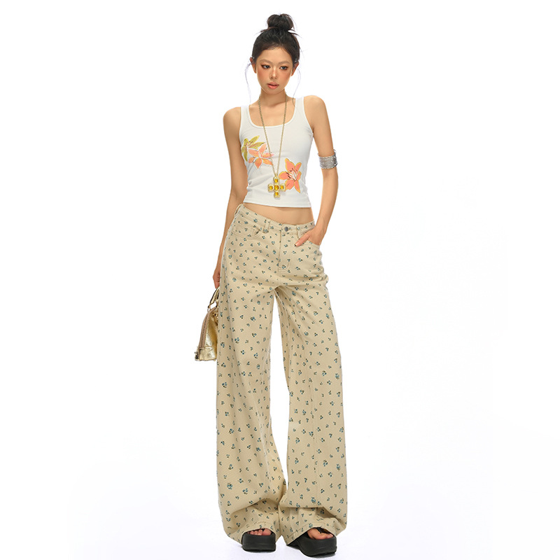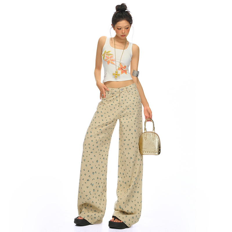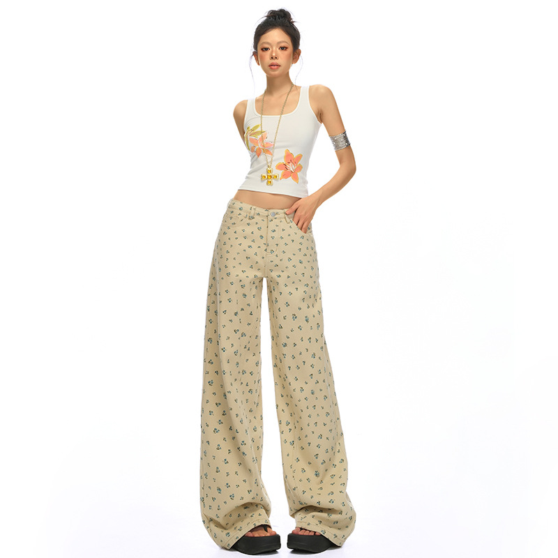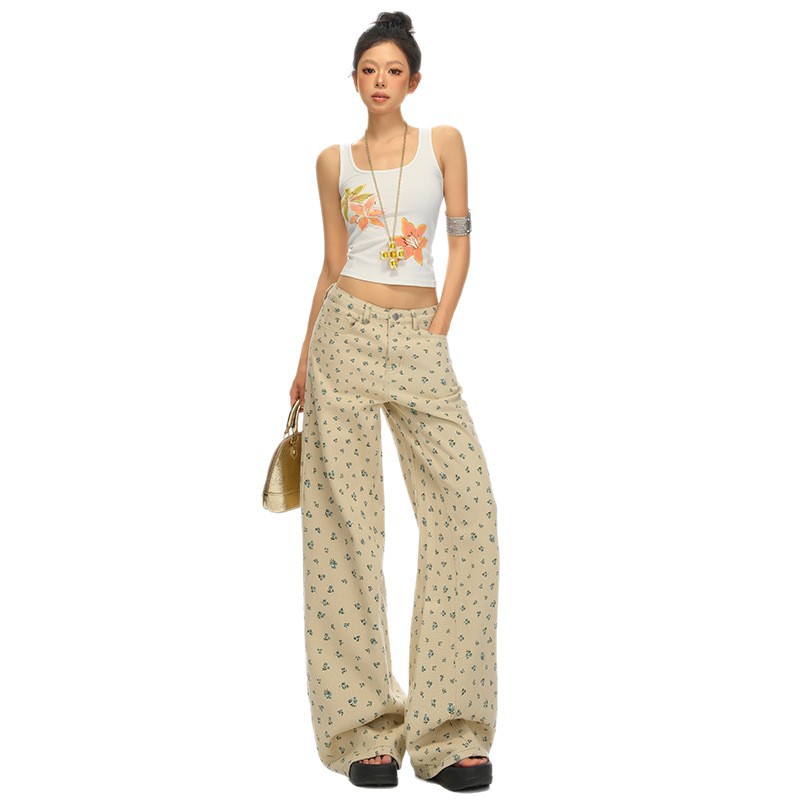 2025复古港风小清新碎花直筒牛仔裤显瘦宽松阔腿裤女