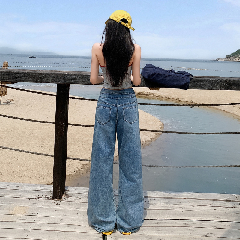 美式复古直筒牛仔裤女2025夏季新款高腰显瘦窄版小个子设计感阔腿