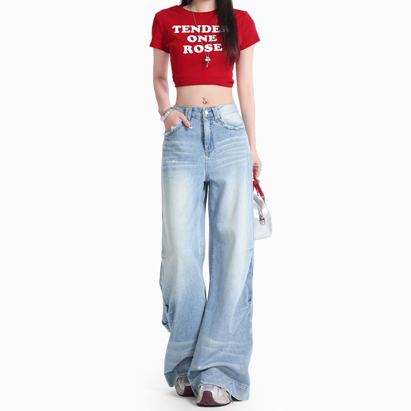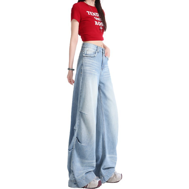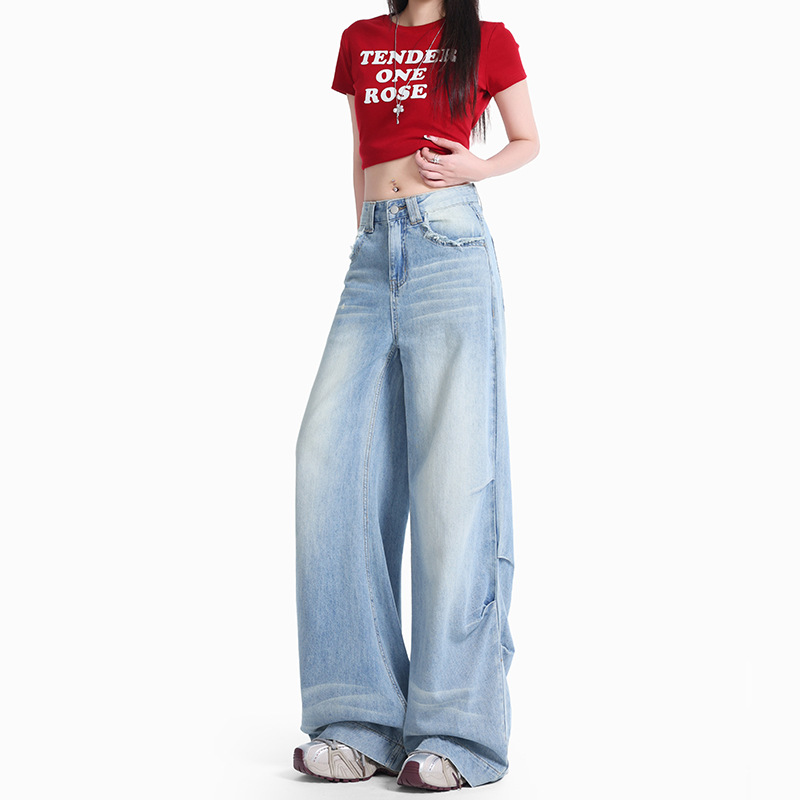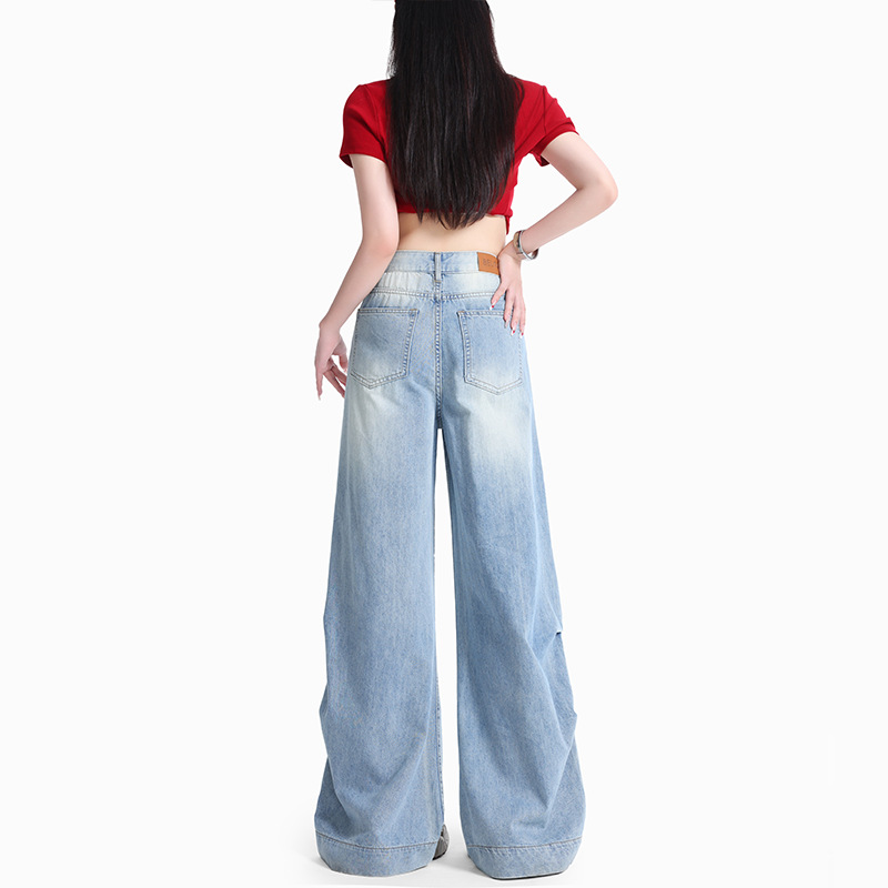 浅蓝阔腿牛仔裤女2025夏季新款设计感高腰宽松显瘦垂感直筒拖地裤