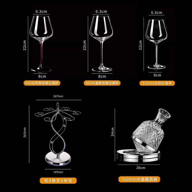 | 颜色 | 【主图白钻520ml】白钻红酒杯6只装+8字杯架+陀螺醒酒器 | 颜色 | 【红杆450ml】红酒杯6只装+8字杯架+陀螺醒酒器 |