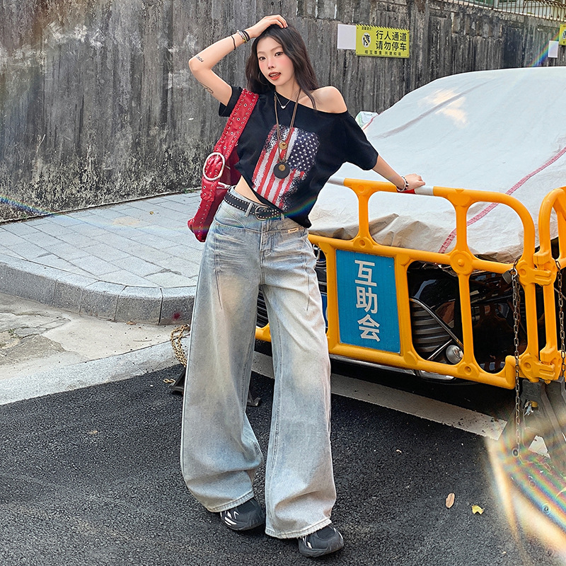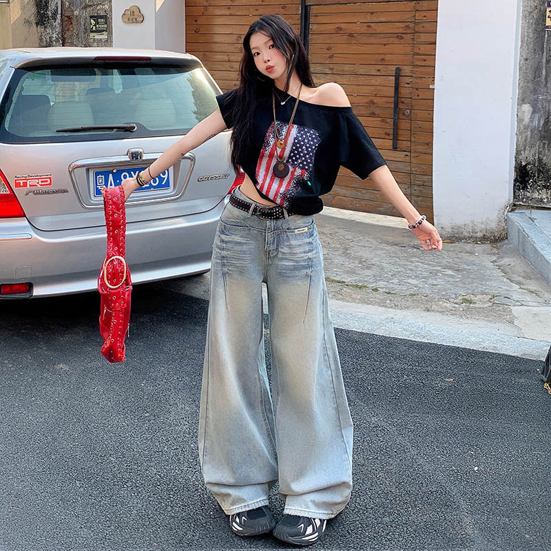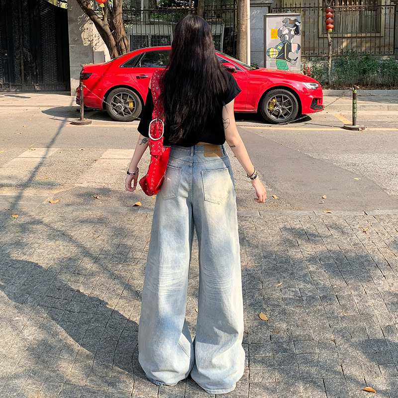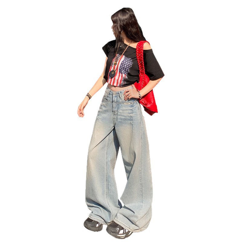 浅蓝色阔腿牛仔裤女2025夏季新款美式设计感宽松直筒垂感拖地裤子