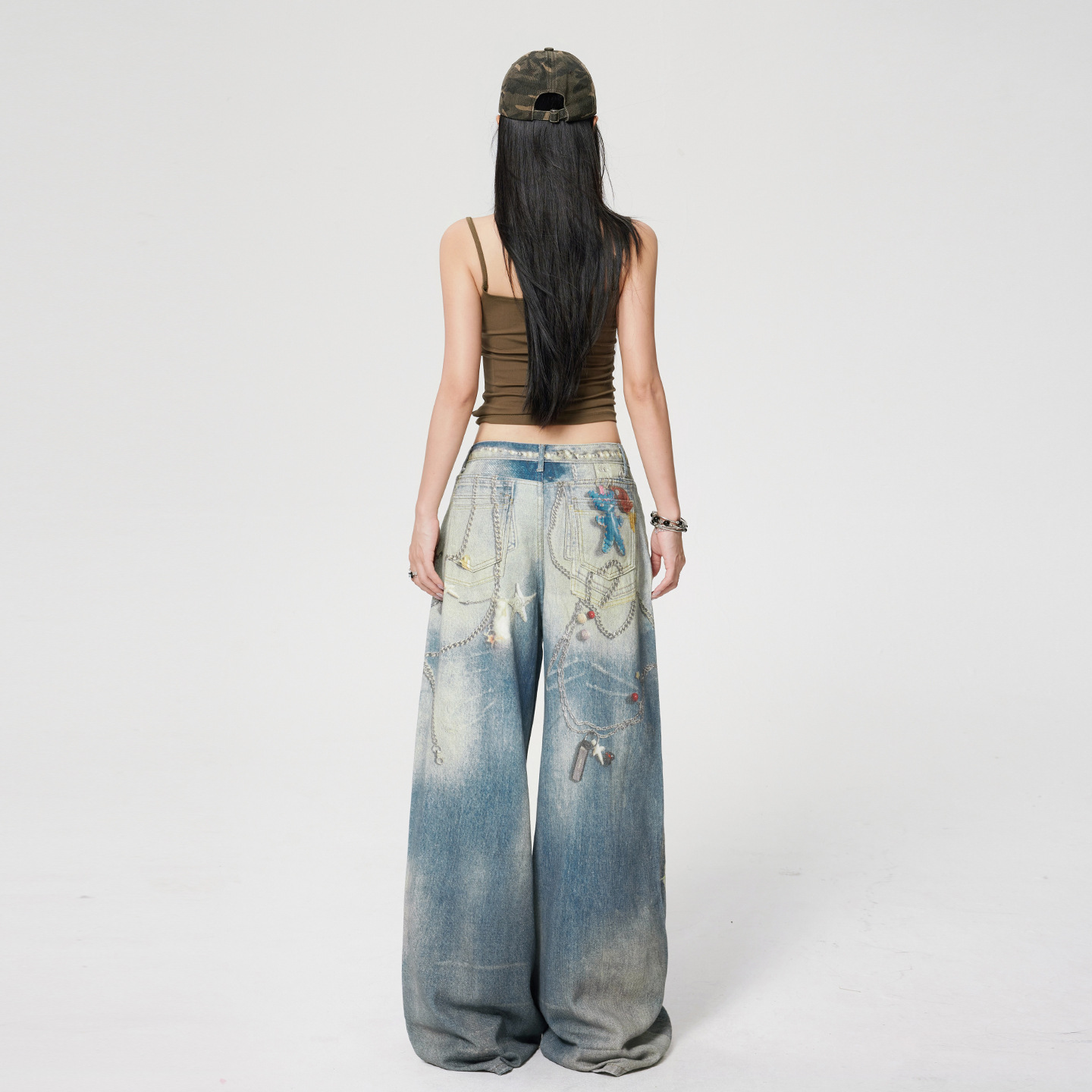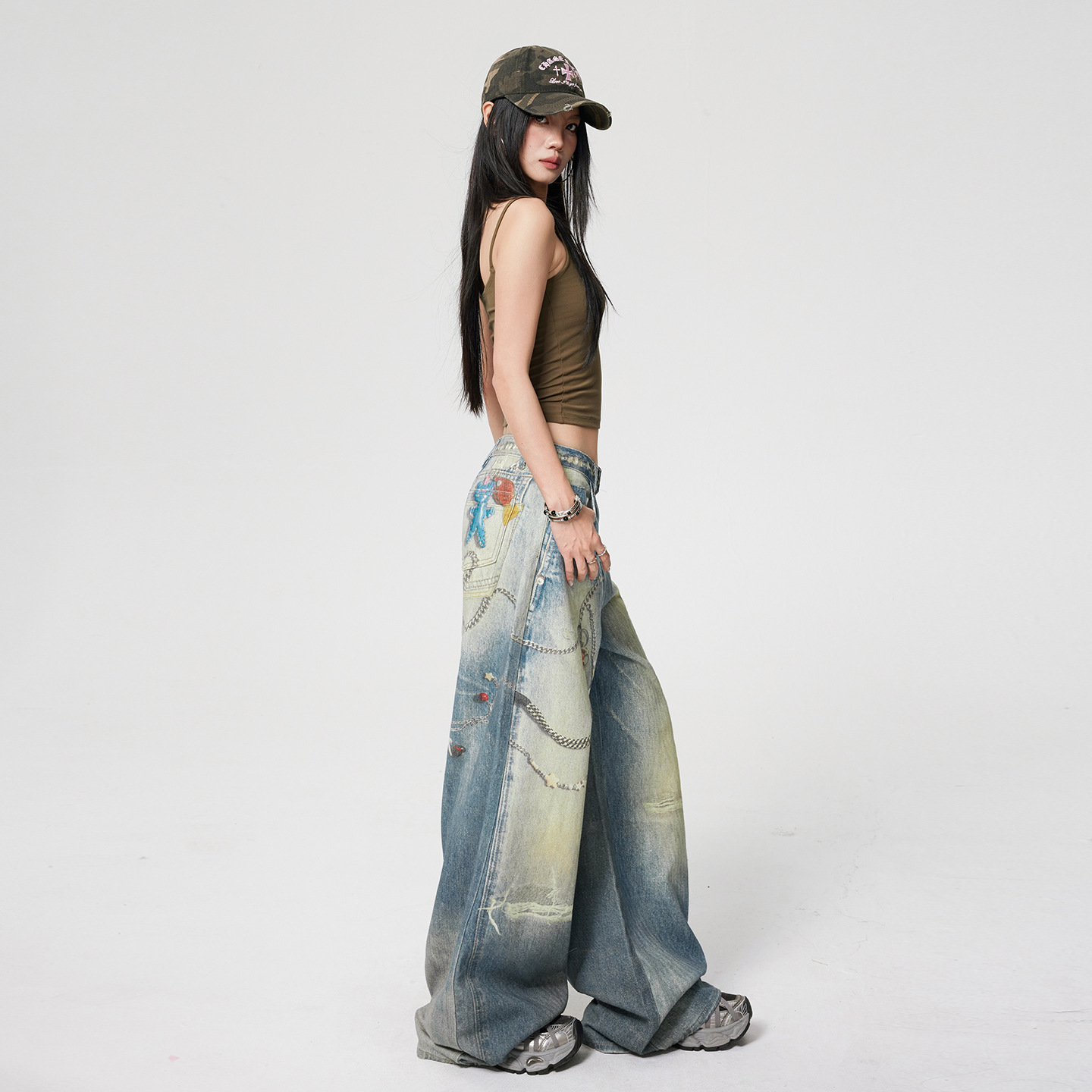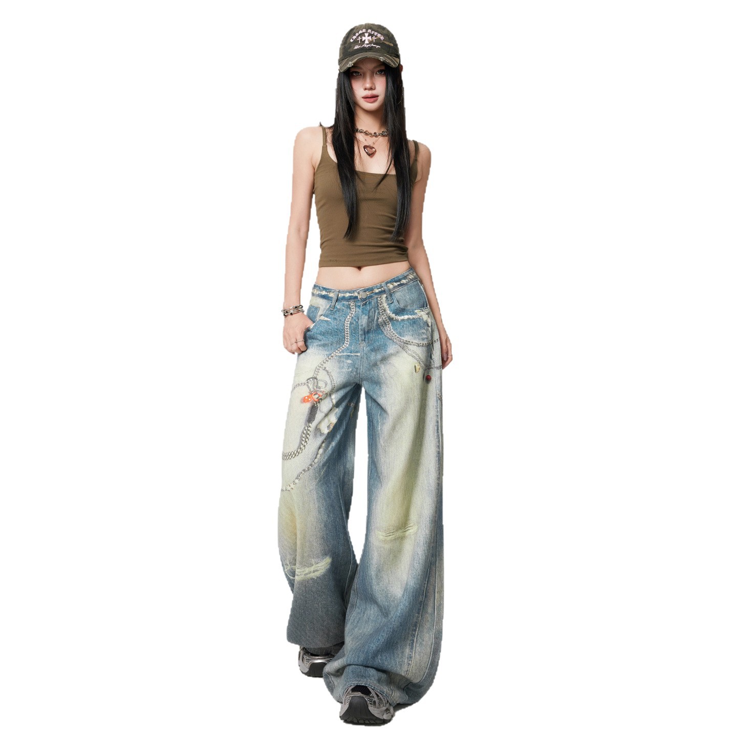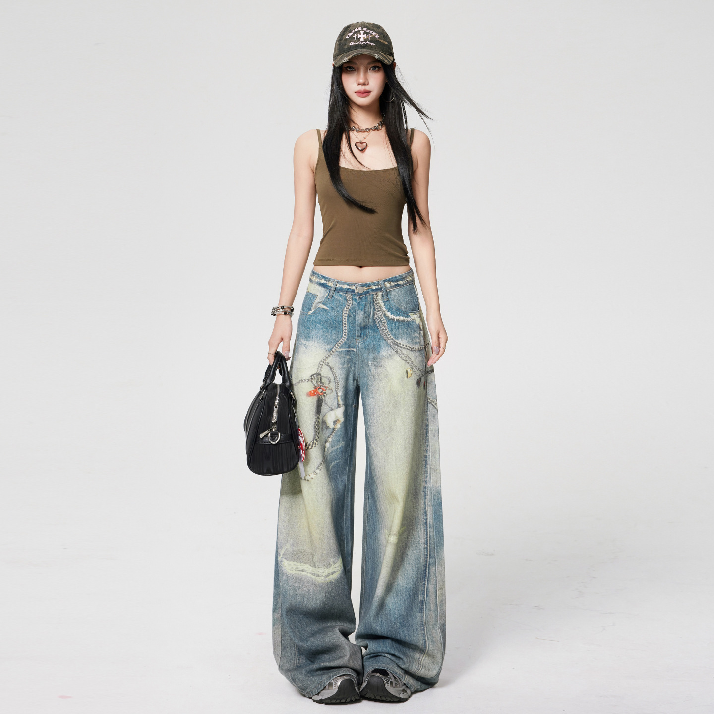 2025夏秋新款美式复古宽松阔腿牛仔裤女宽松直筒百搭显瘦拖地裤