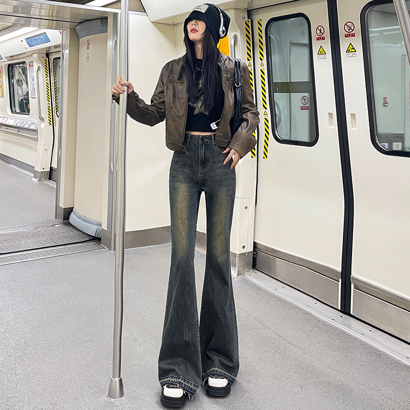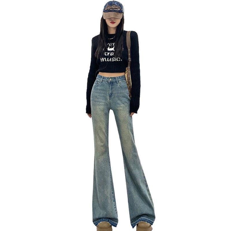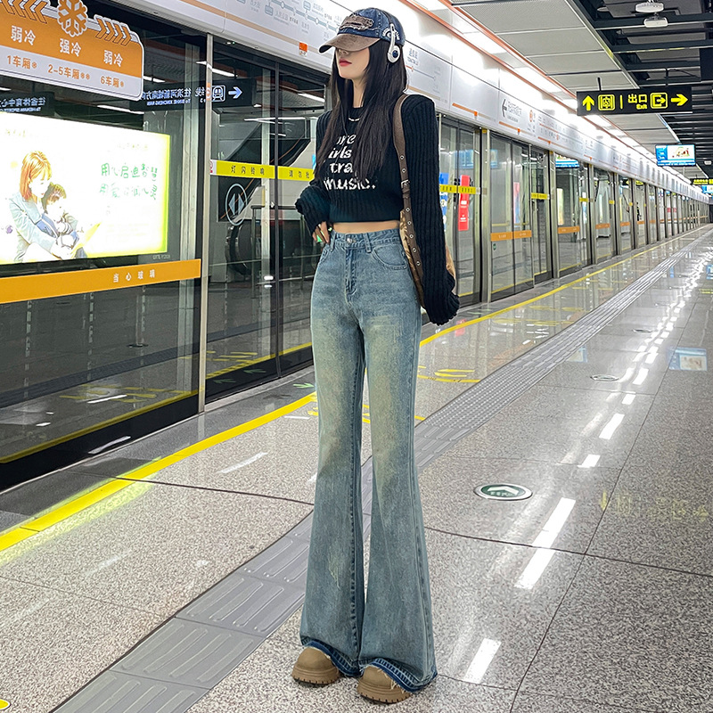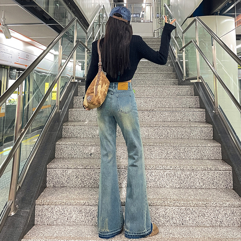 美式辣妹中腰水洗磨破微喇叭牛仔裤女春秋款慵懒松弛感显瘦长裤子