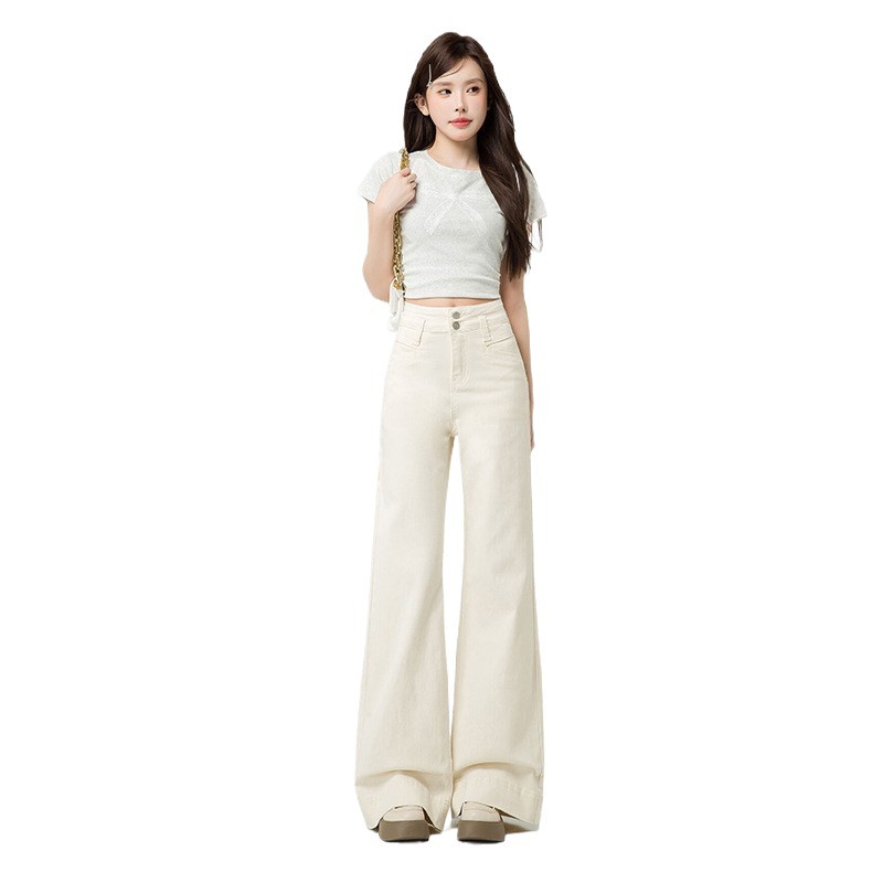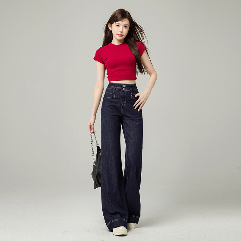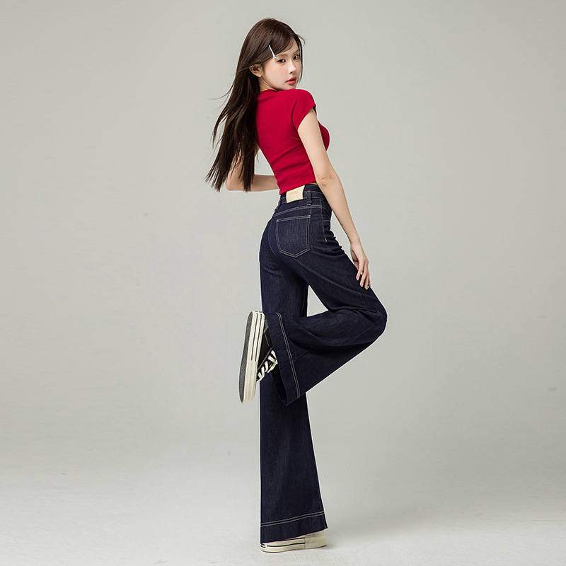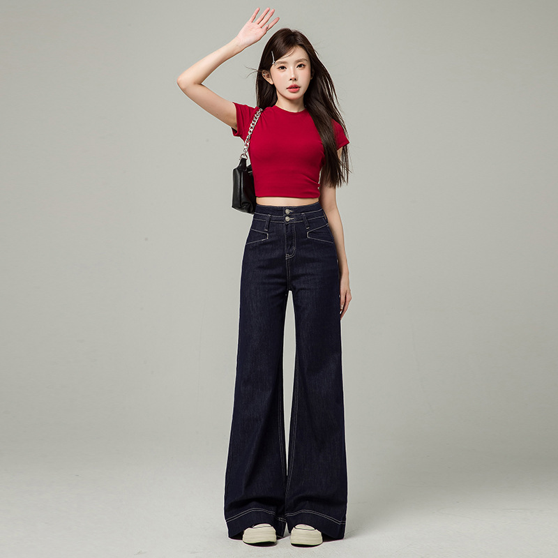 美式深蓝色阔腿微喇牛仔裤女夏季2025新款丹宁高腰不贴腿喇叭裤子