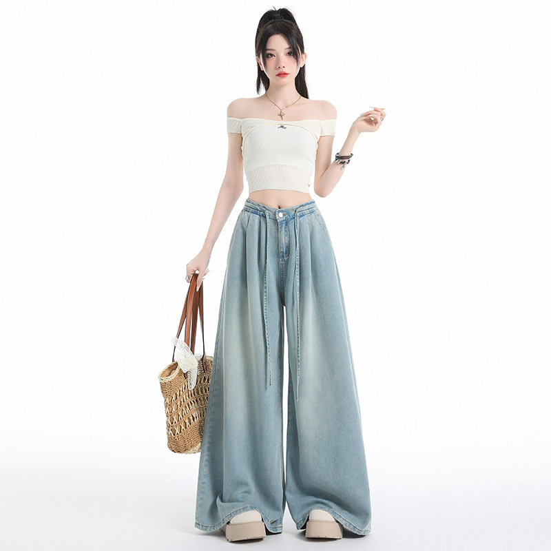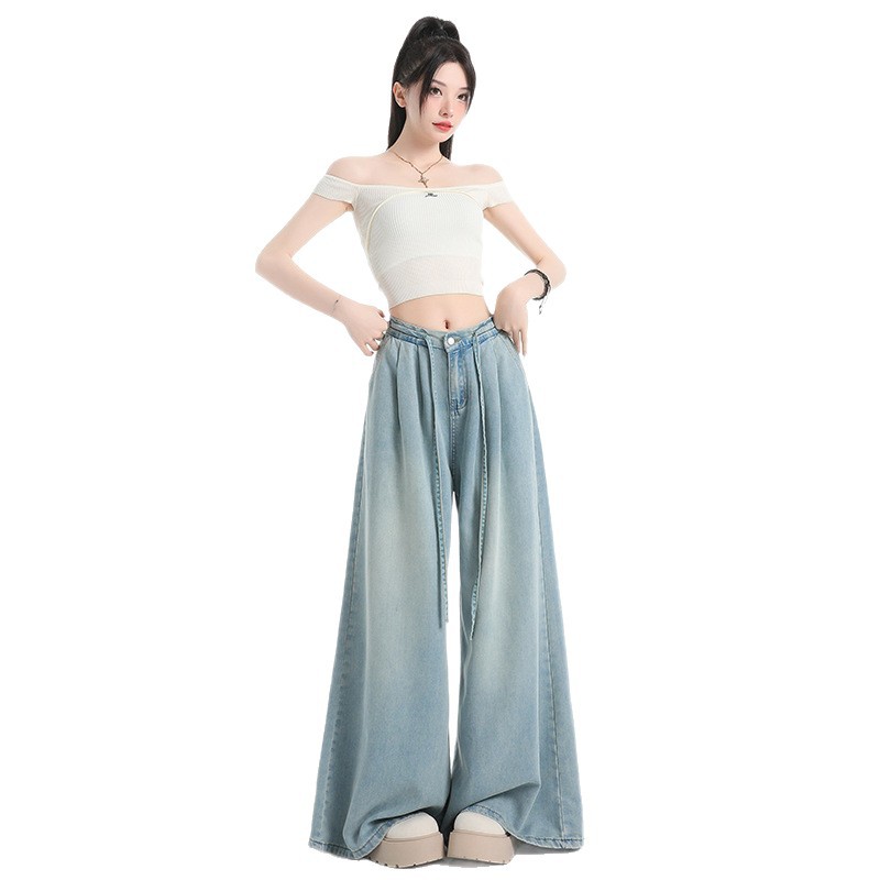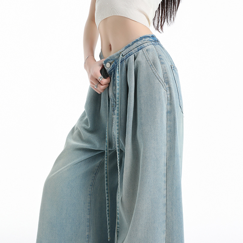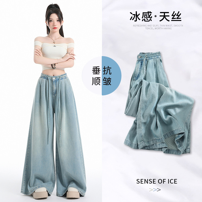 怀旧蓝褶皱冰丝裤裙女抽绳夏季新款高腰显瘦垂感宽松直筒拖地长裤