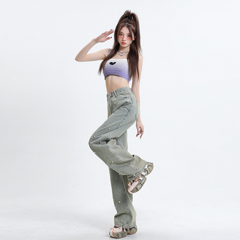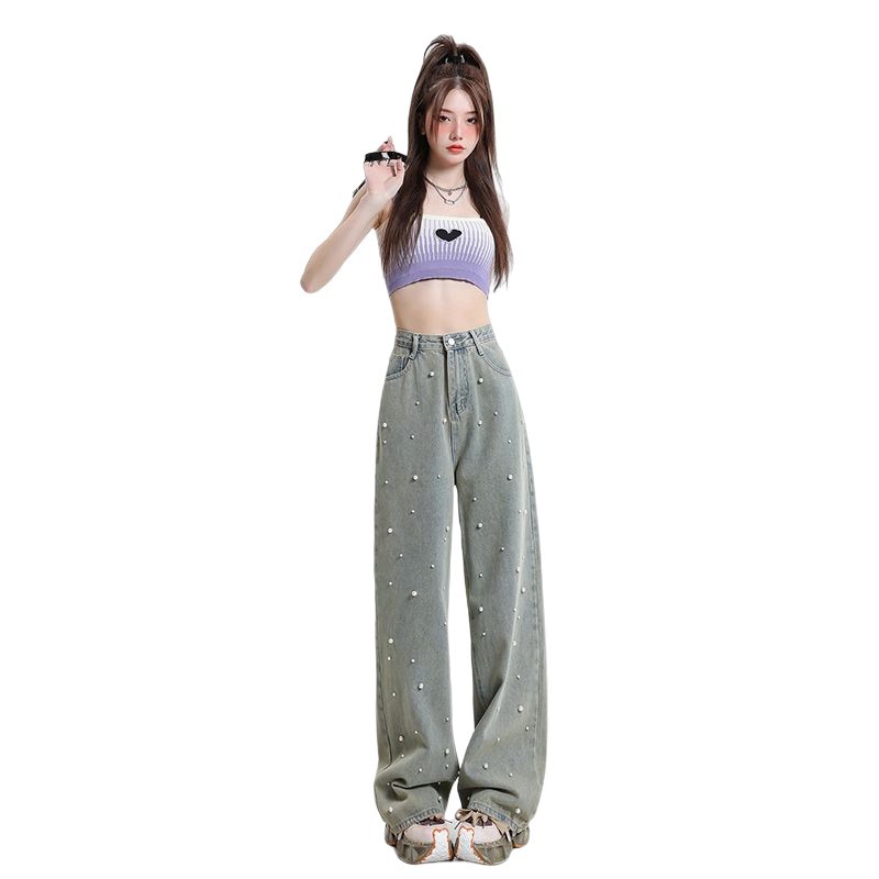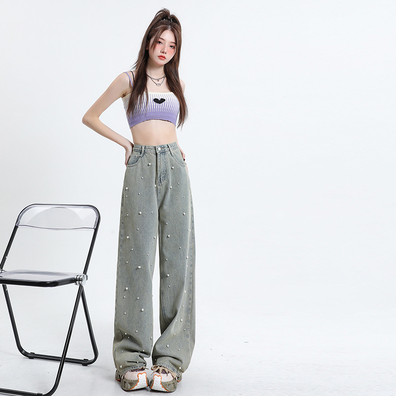 钉珠牛仔裤女夏季薄款2025年新款直筒宽松高腰窄版拖地阔腿裤子女