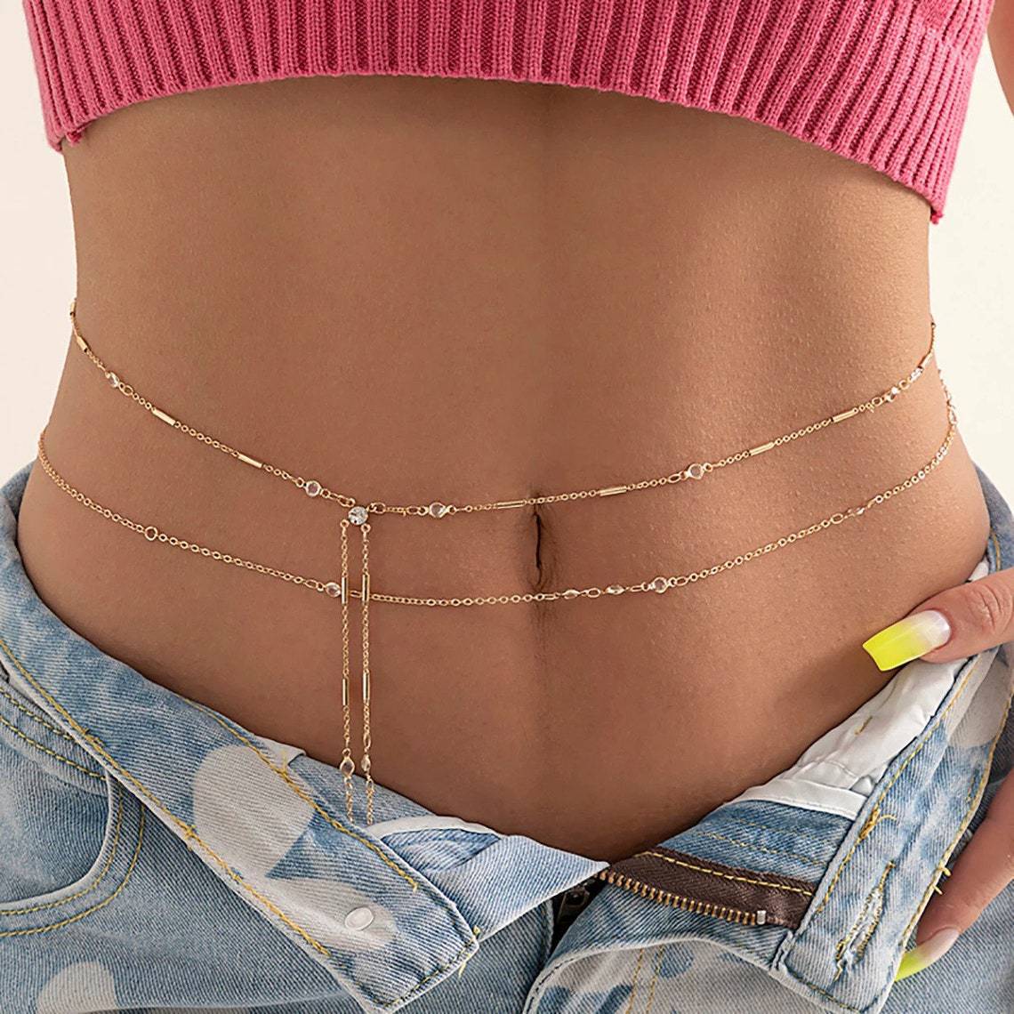 跨境饰品 时尚性感闪亮双层细链流苏身体链女 百搭仿水晶锆石腰链