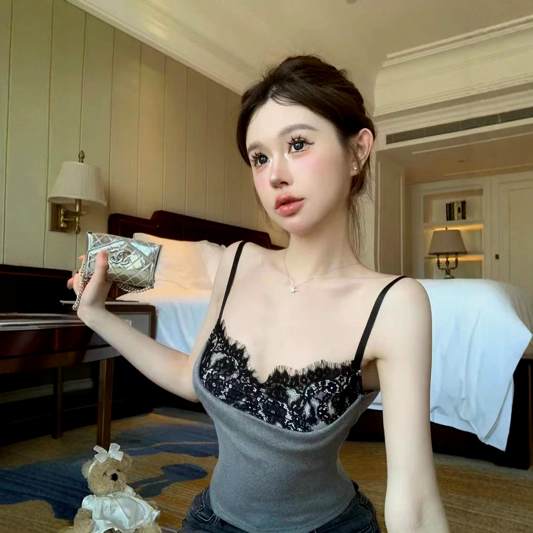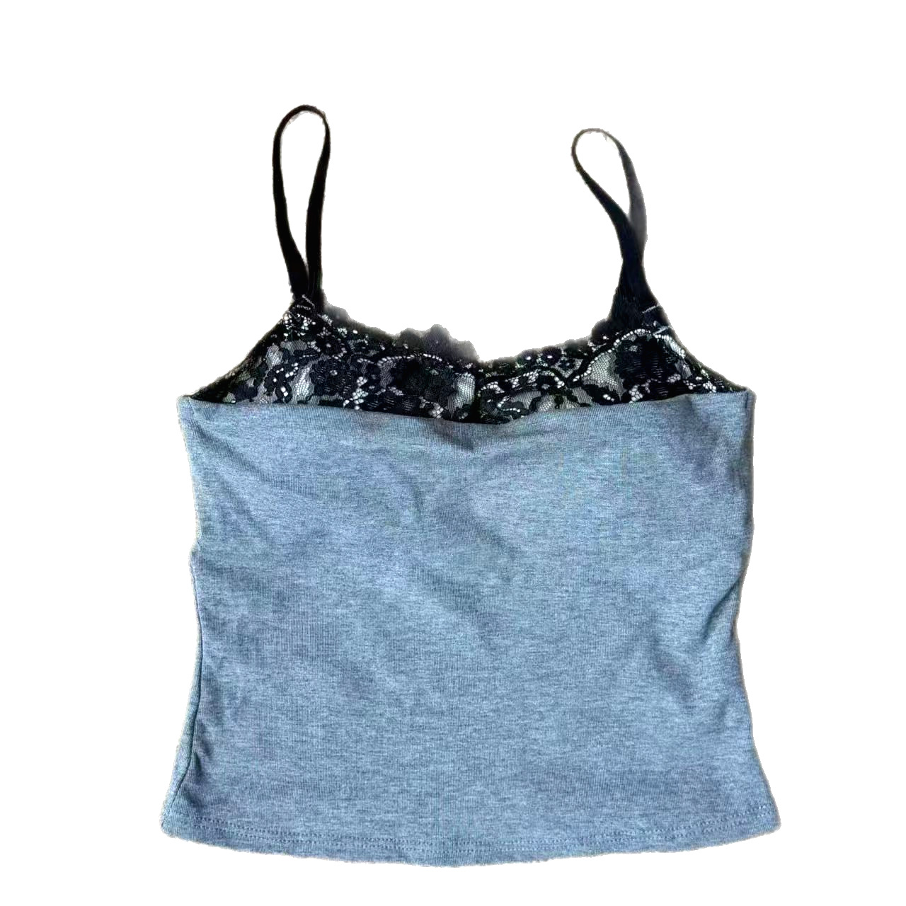 性感独特精致灰色吊带纯欲风蕾丝拼接背心夏女带胸垫显瘦外穿上衣