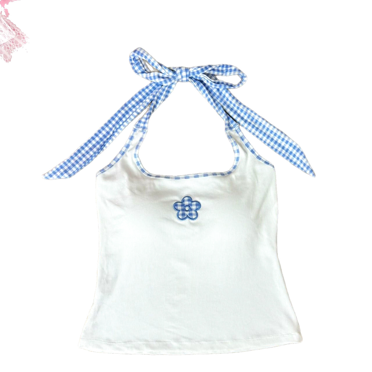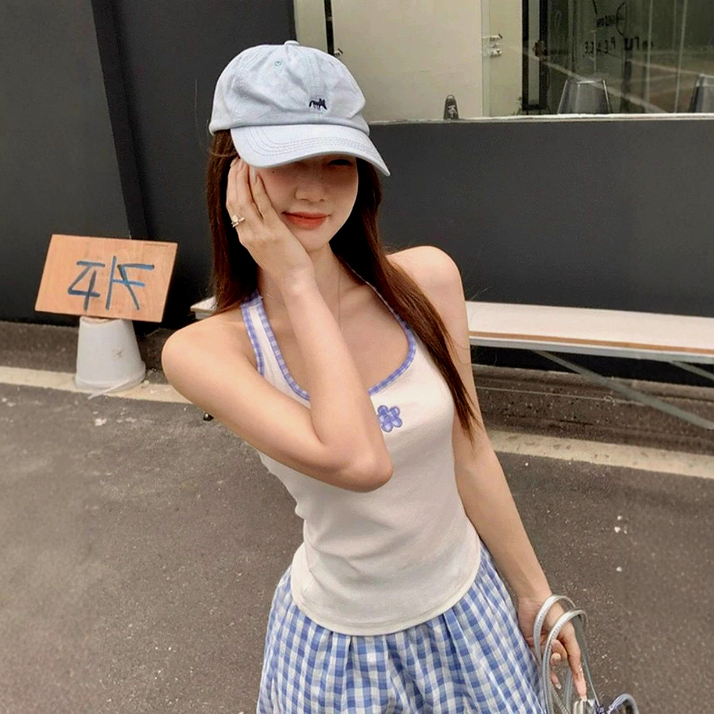 甜辣格纹撞色拼接刺绣花朵挂脖带胸垫吊带背心露背纯欲无袖上衣女