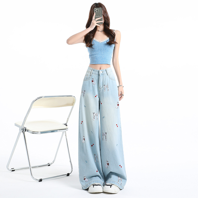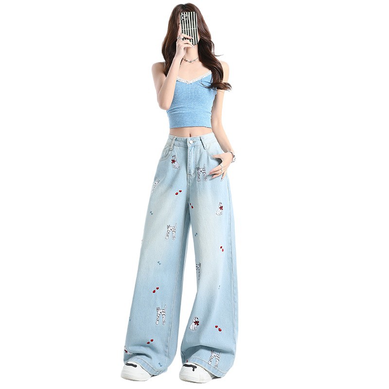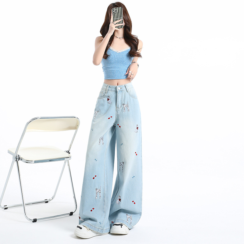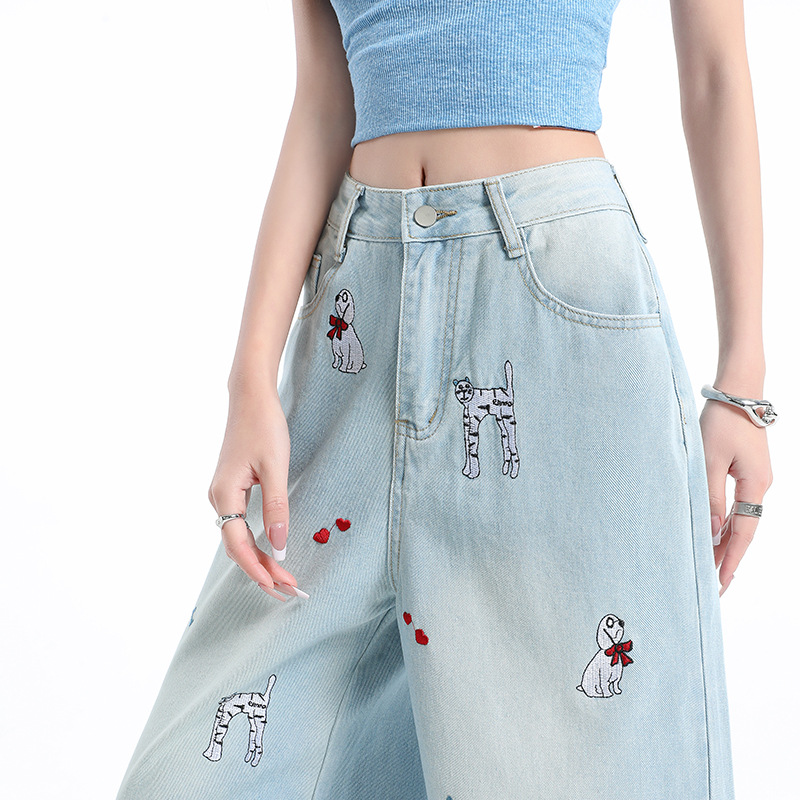 高个子175加长版浅色小狗刺绣直筒牛仔裤女夏高腰显瘦垂感阔腿裤