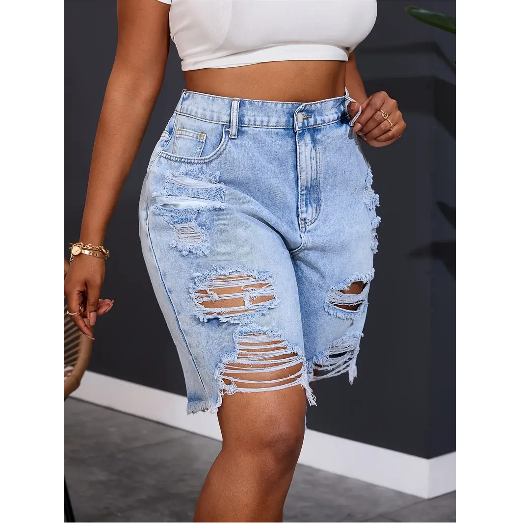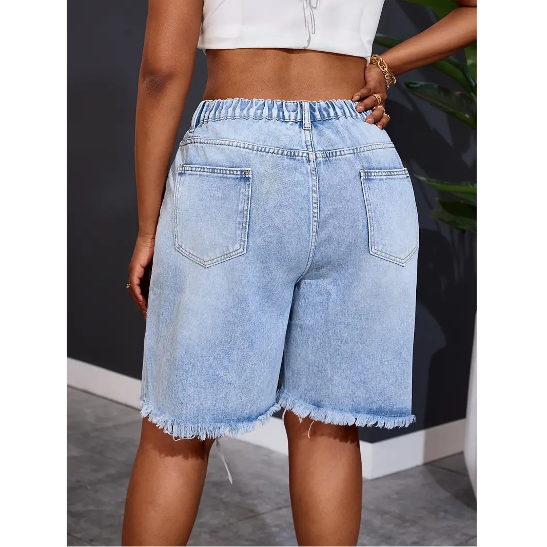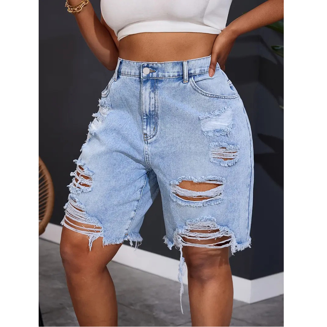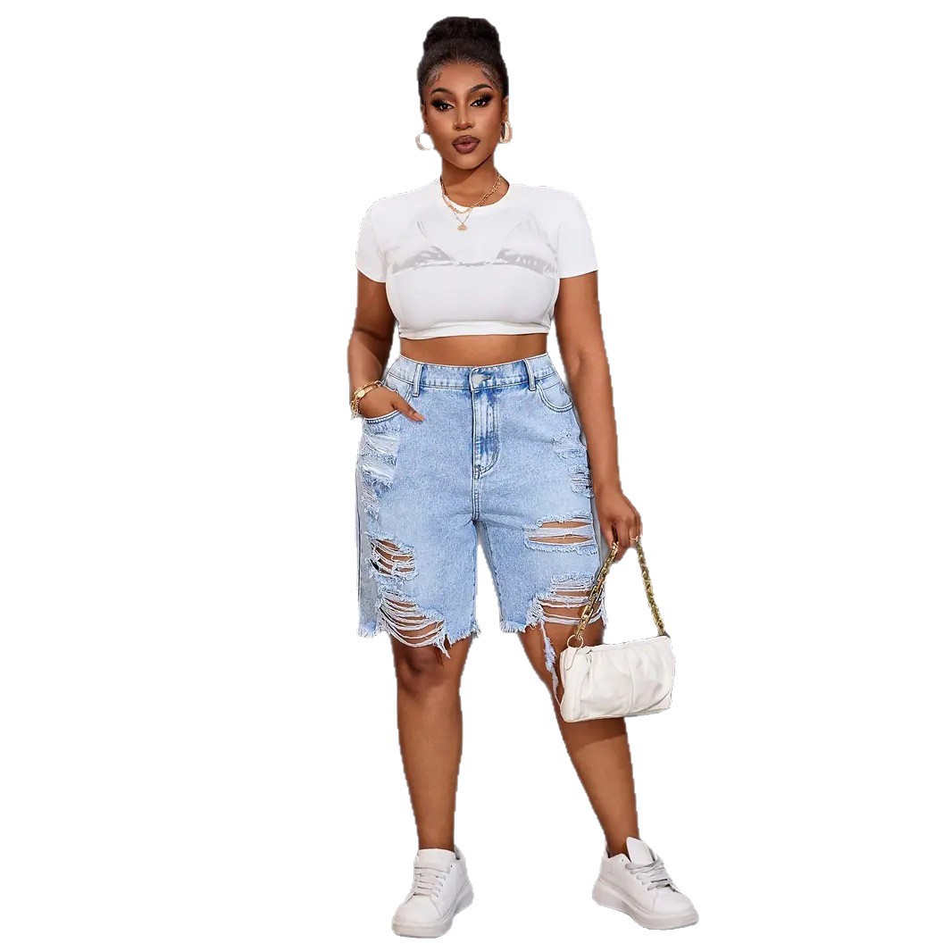 跨境2025独立站新款夏季短裤直筒裤洗水破洞百搭女牛仔裤厂家直销