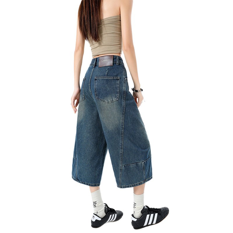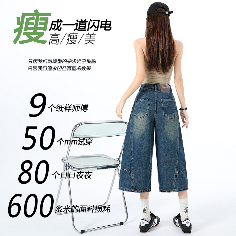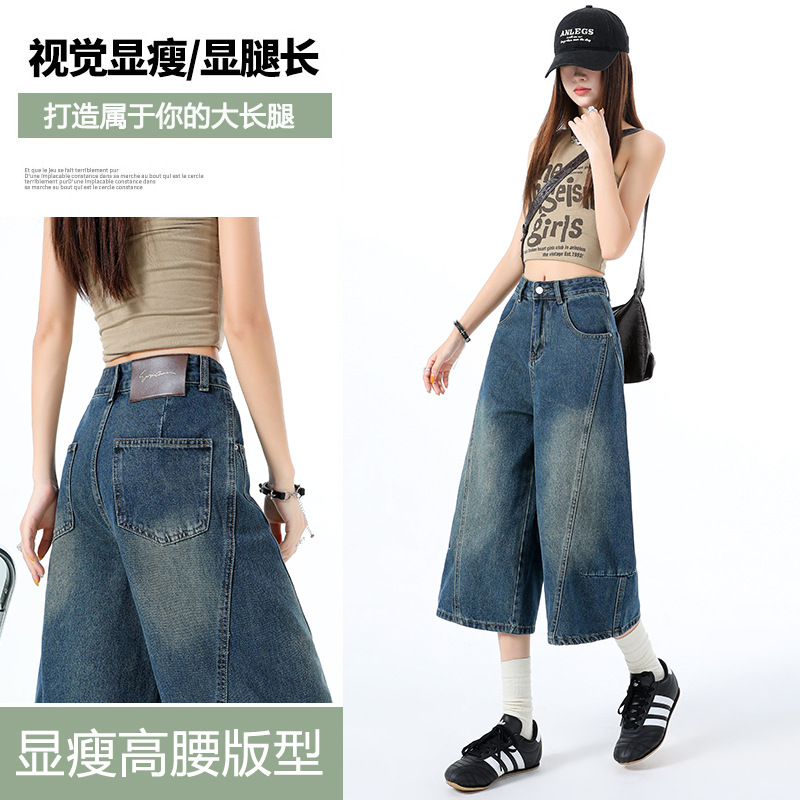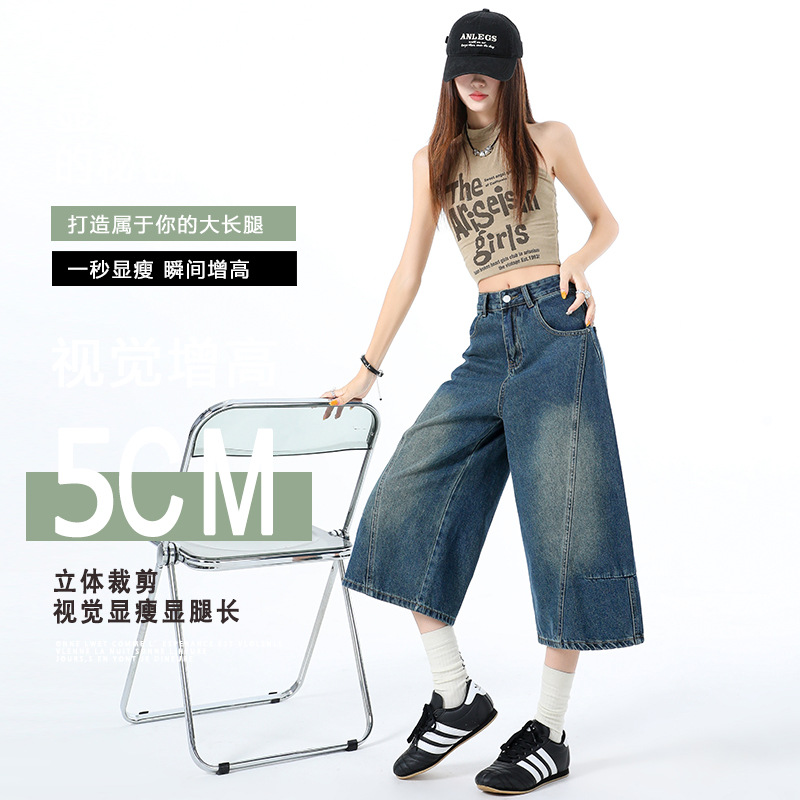 欧货复古高腰七分阔腿牛仔短裤女宽松韩版百搭休闲直筒中裤