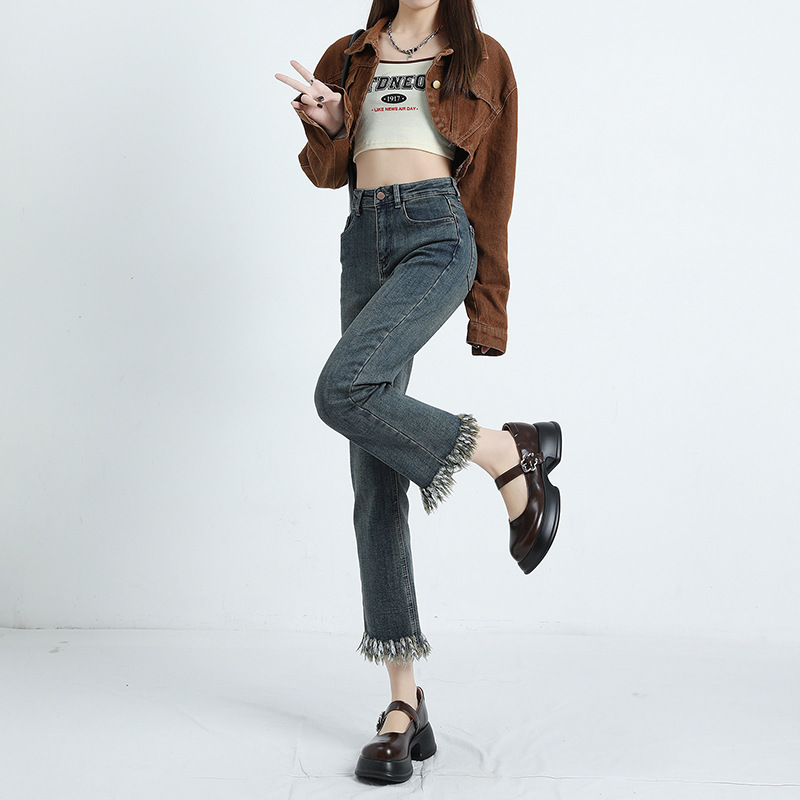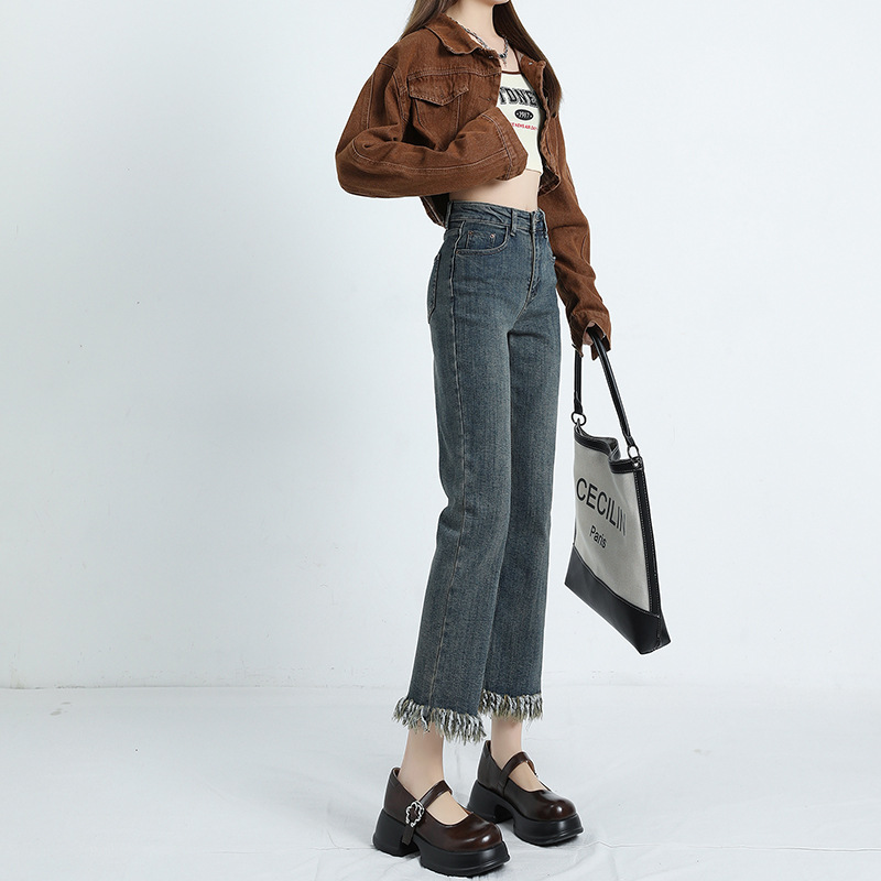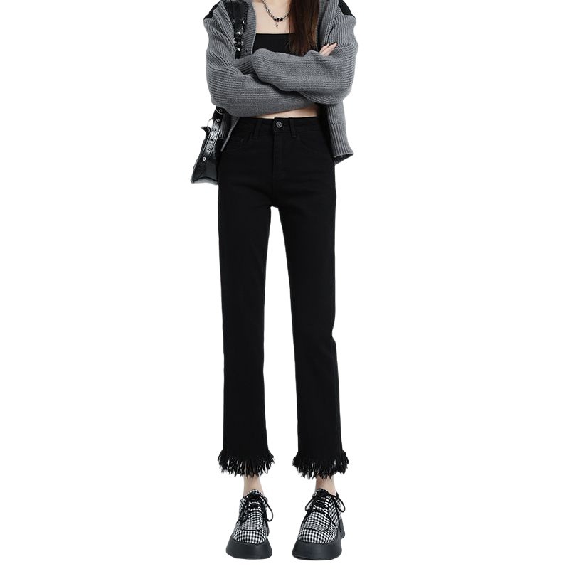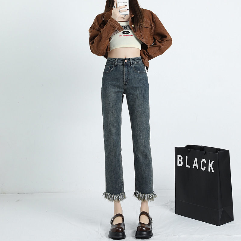 流苏毛边直筒牛仔裤女春秋2025新款高腰显瘦弹力小个子八分烟管裤