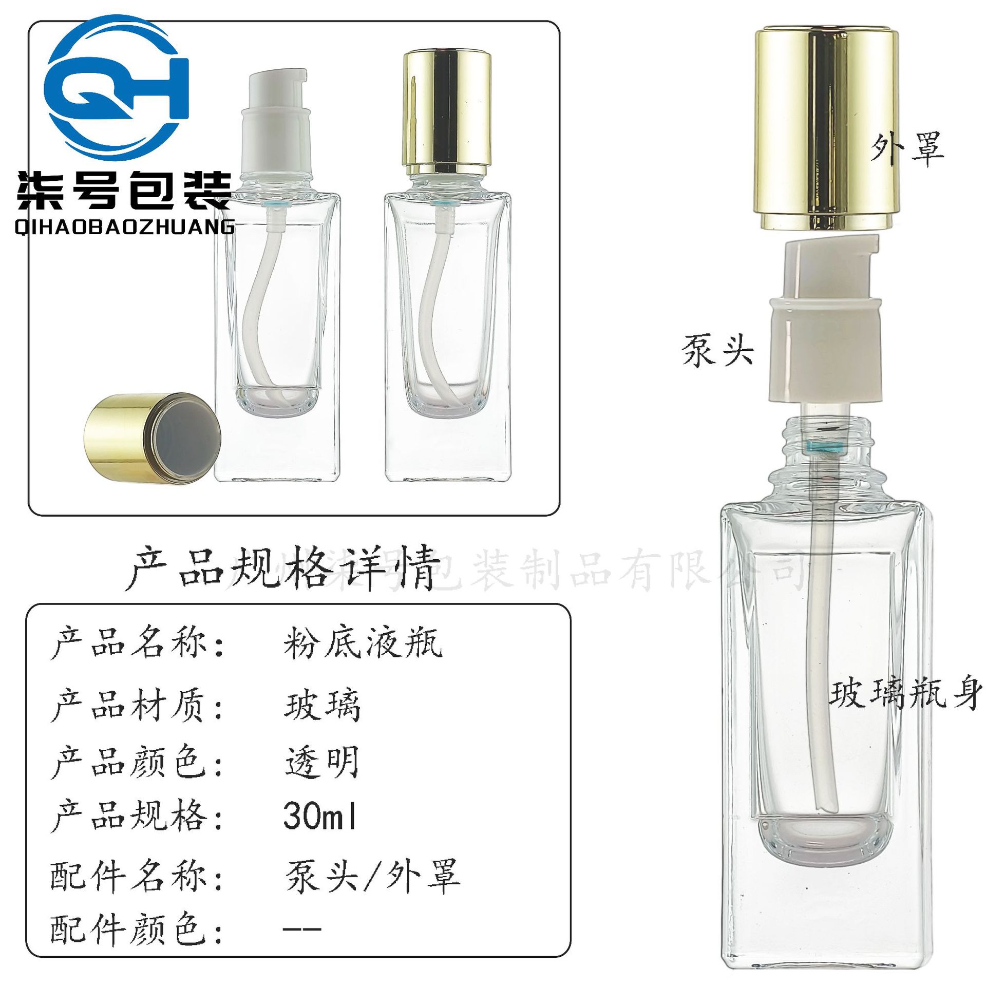 | 规格型号 | 30ml透明光瓶+注塑泵+内电镀外注塑罩;透明;玻璃 | 专用包装 | 化妆品包装 |