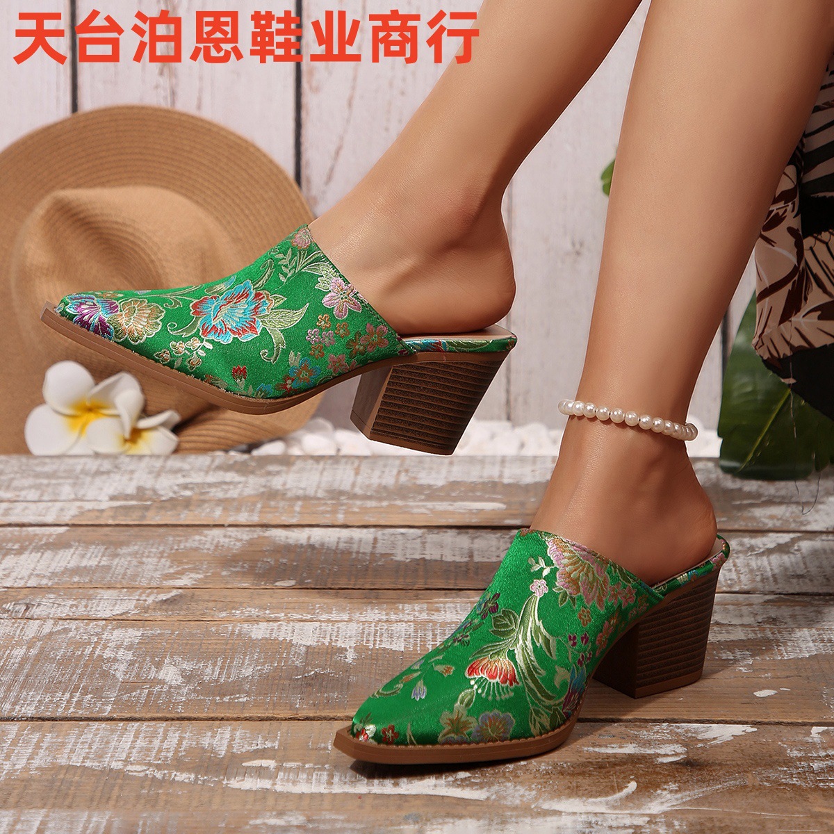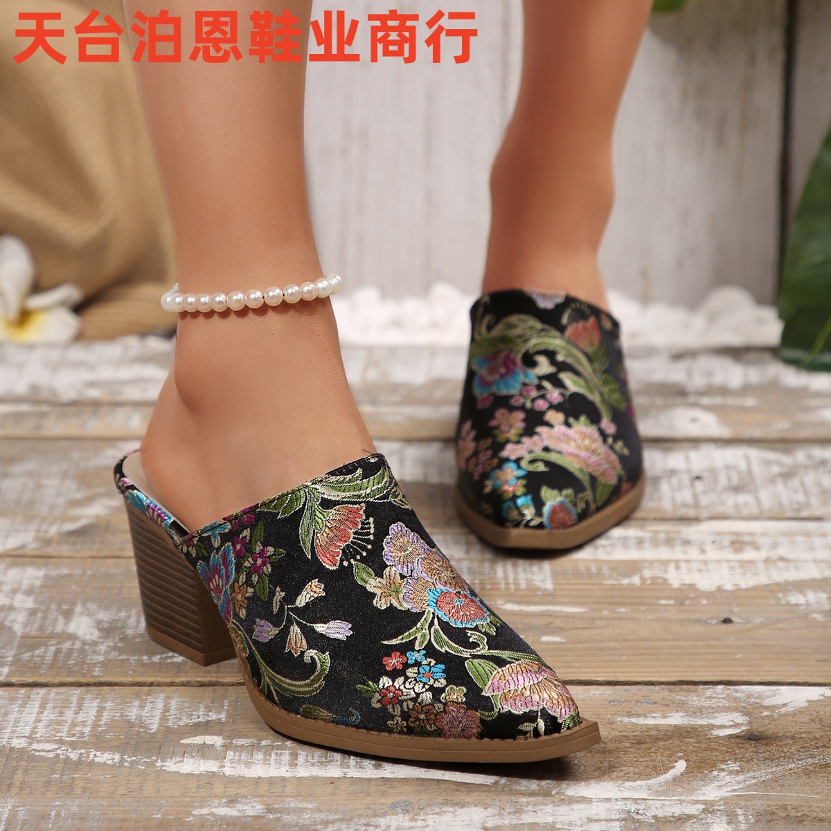 欧美时尚新款复古绸缎刺绣高跟拖鞋外贸粗跟尖头大码女式时装拖鞋