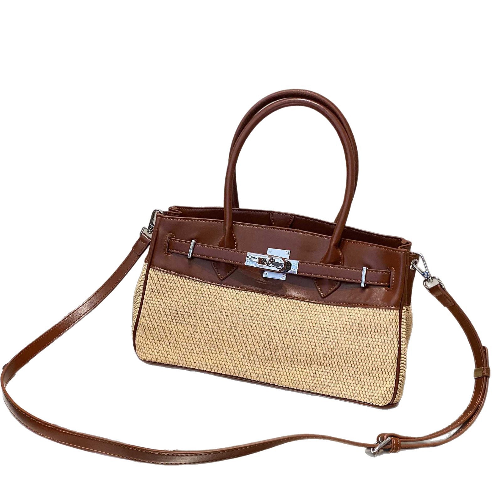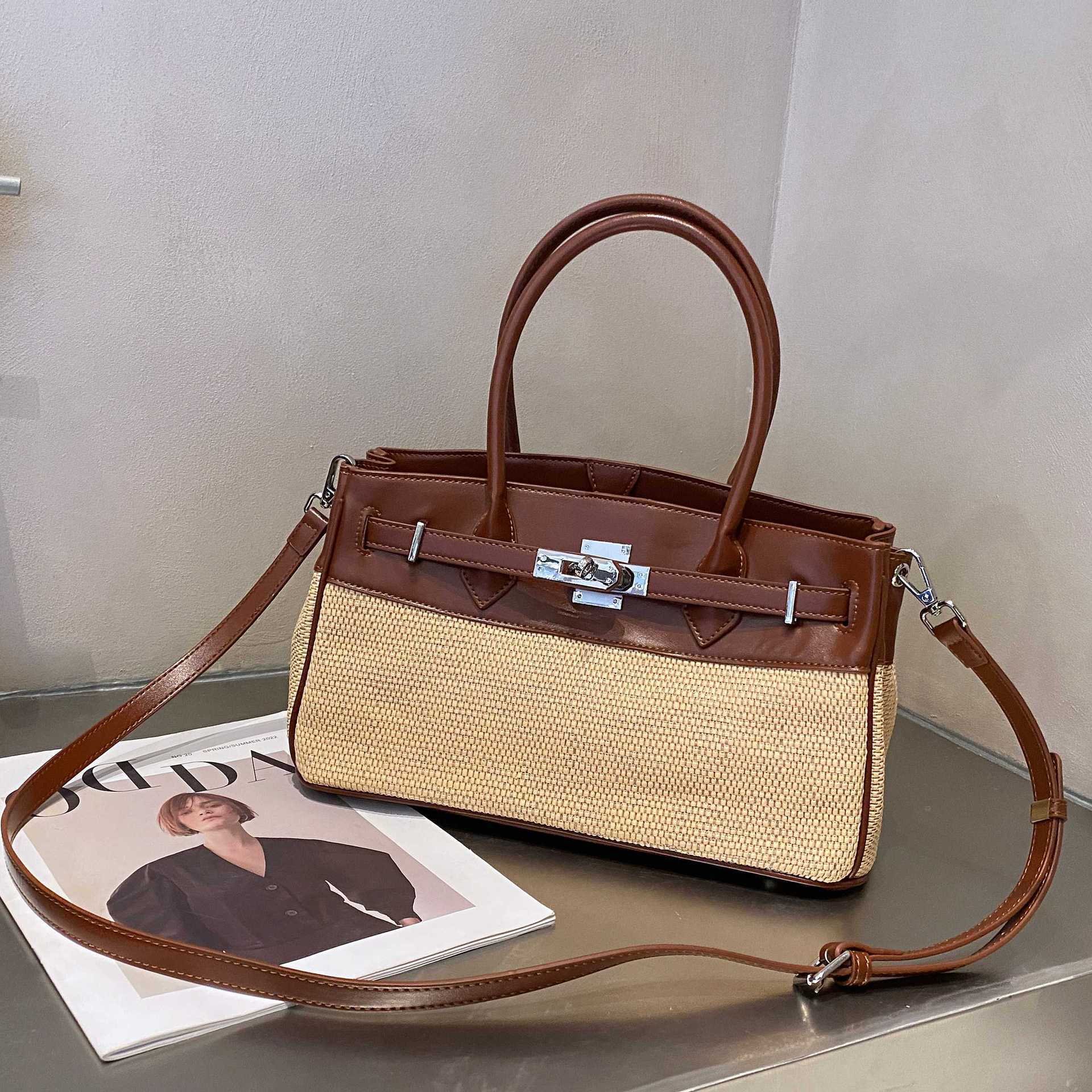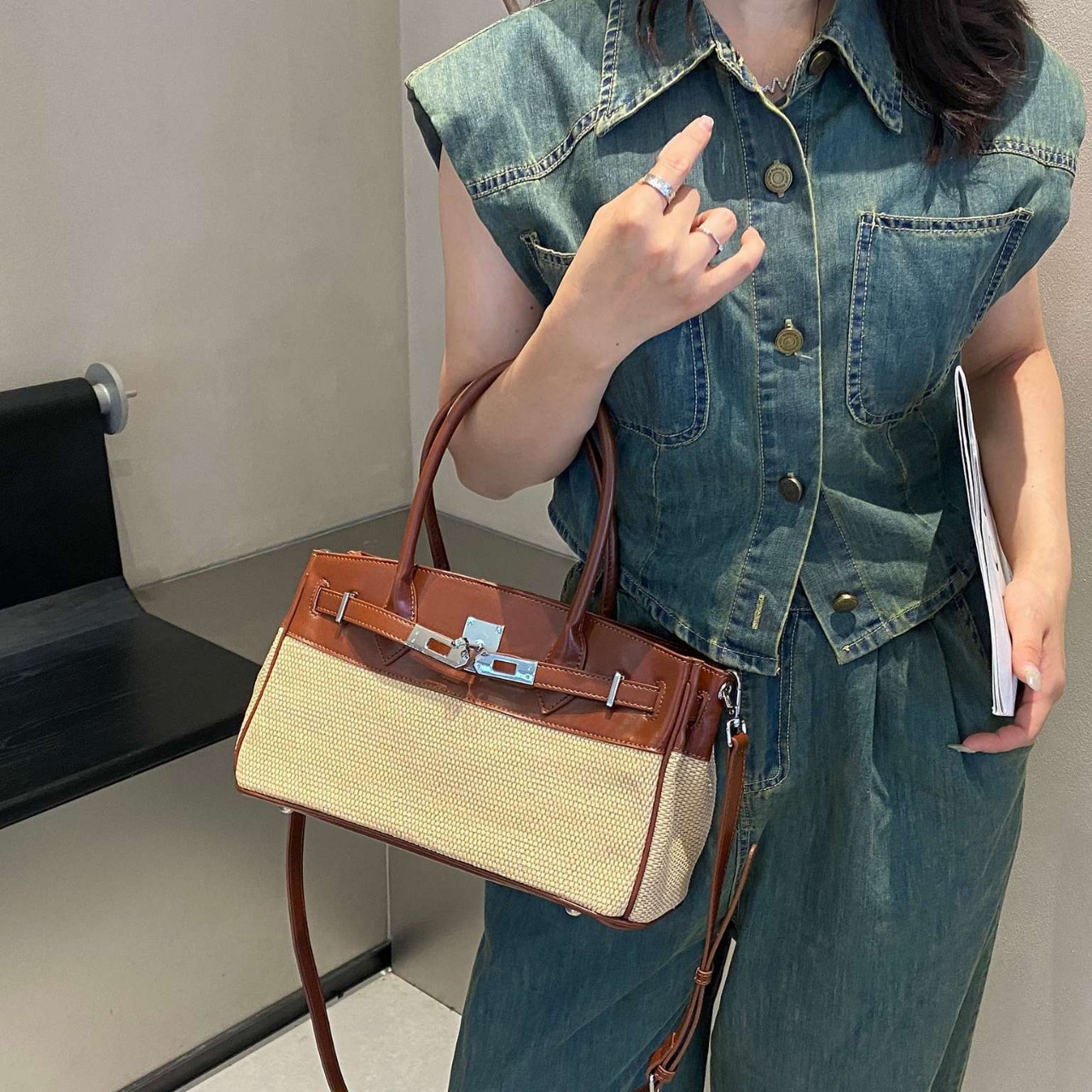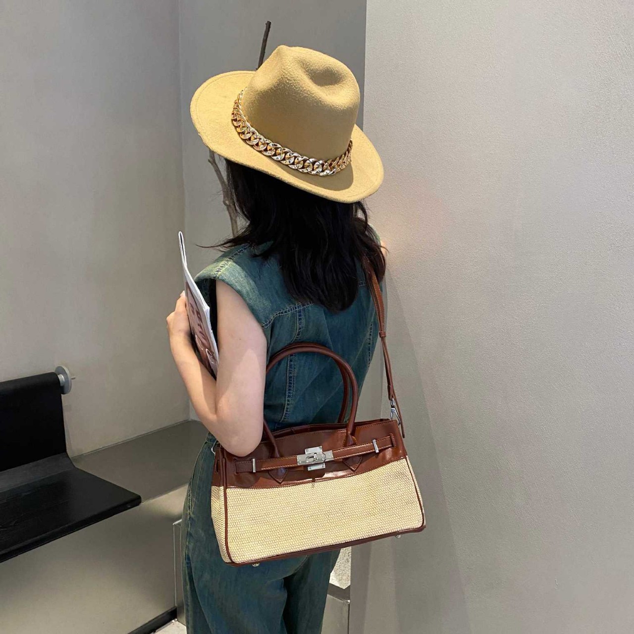 拼接撞色草编腋下铂金包包女2025新款时尚大容量单肩斜挎包轻奢