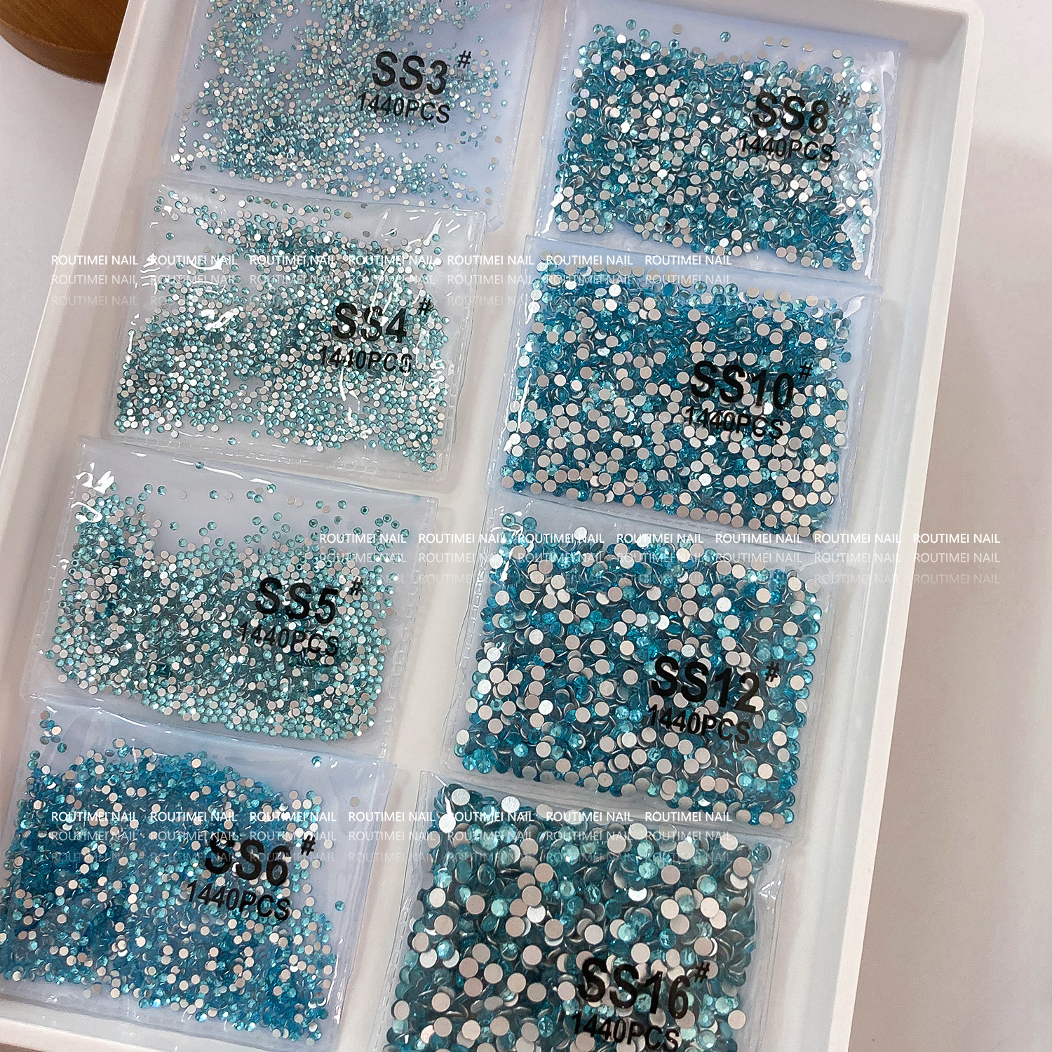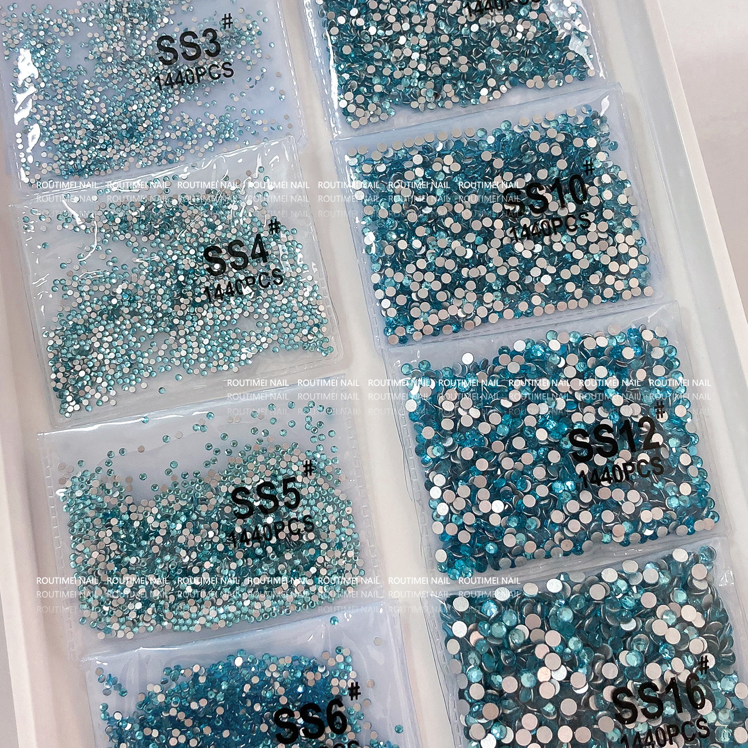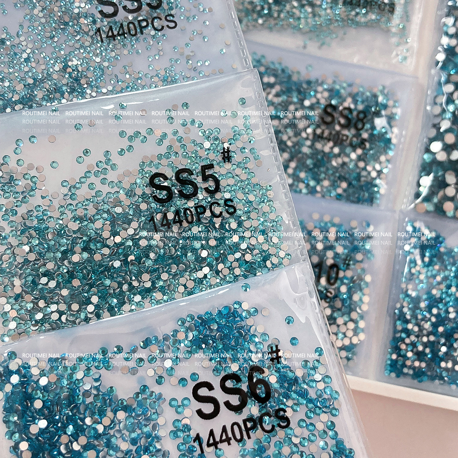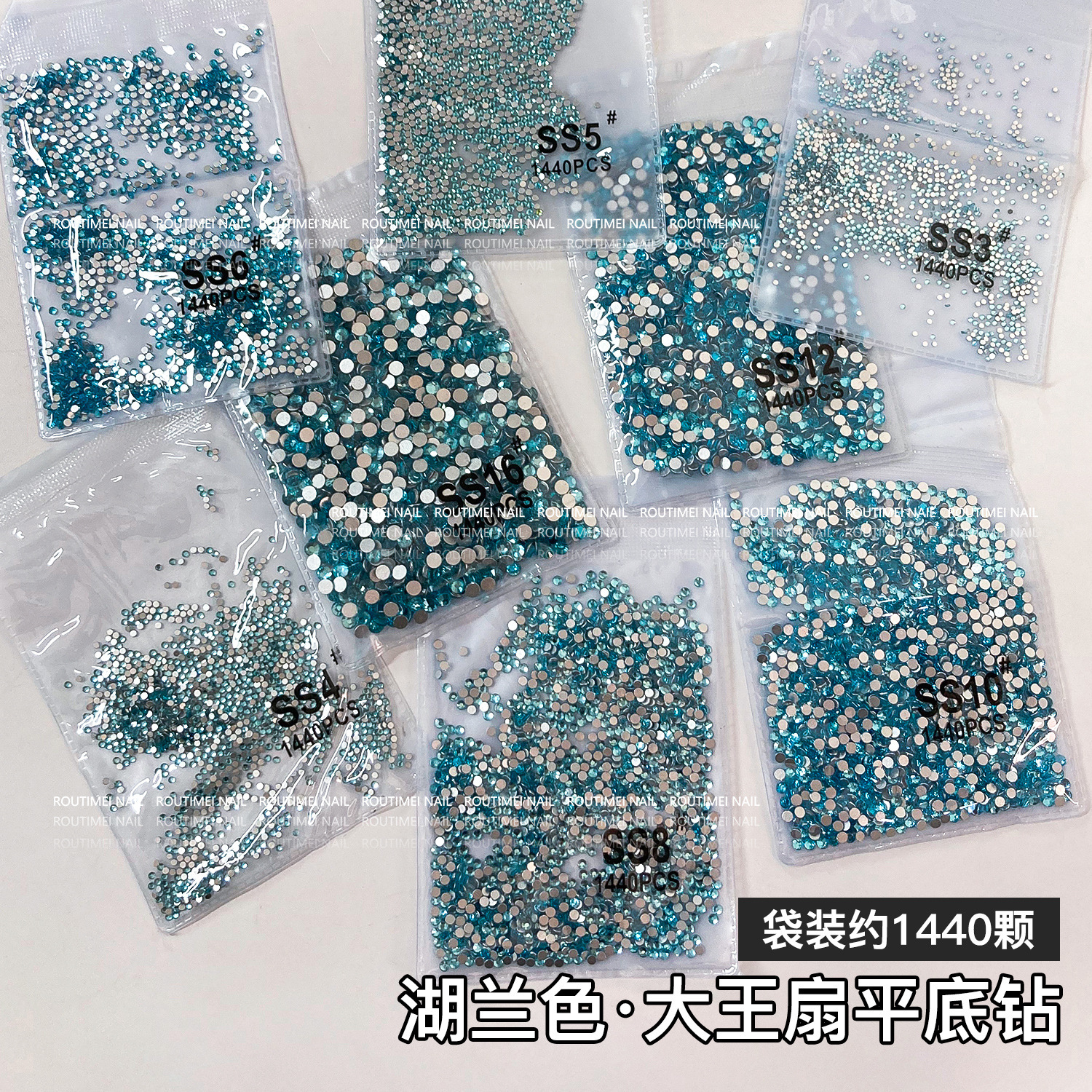 湖蓝色多尺寸大王扇平底钻指甲钻饰袋装1440颗爆闪百搭小红书爆款