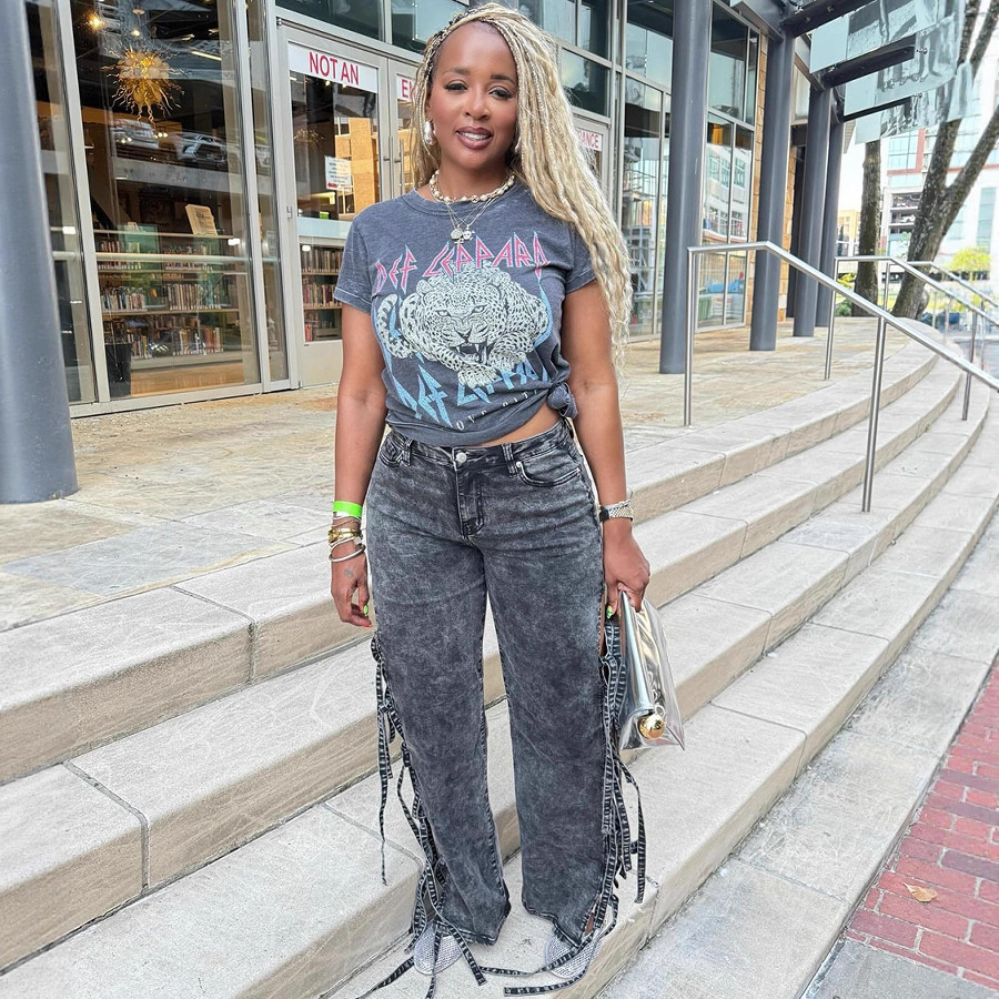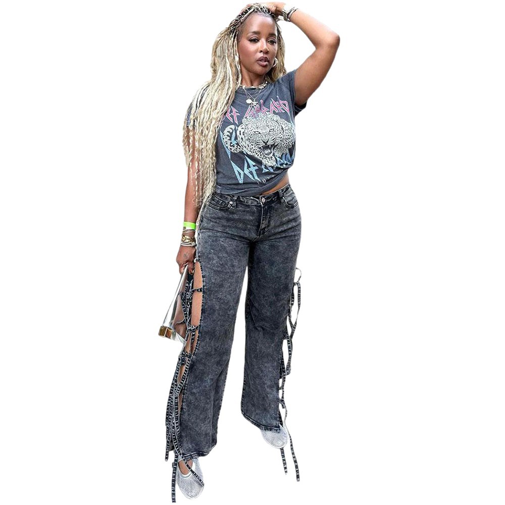 欧美女式牛仔裤亚马逊跨境女装时尚辣妹洗水开衩系绳牛仔高腰长裤