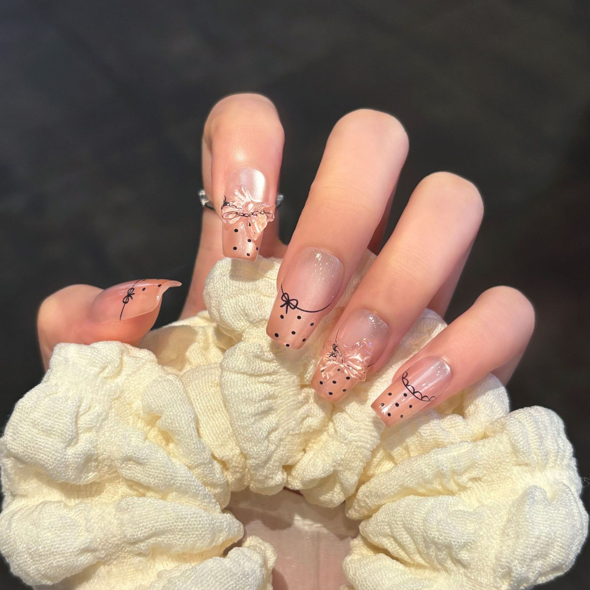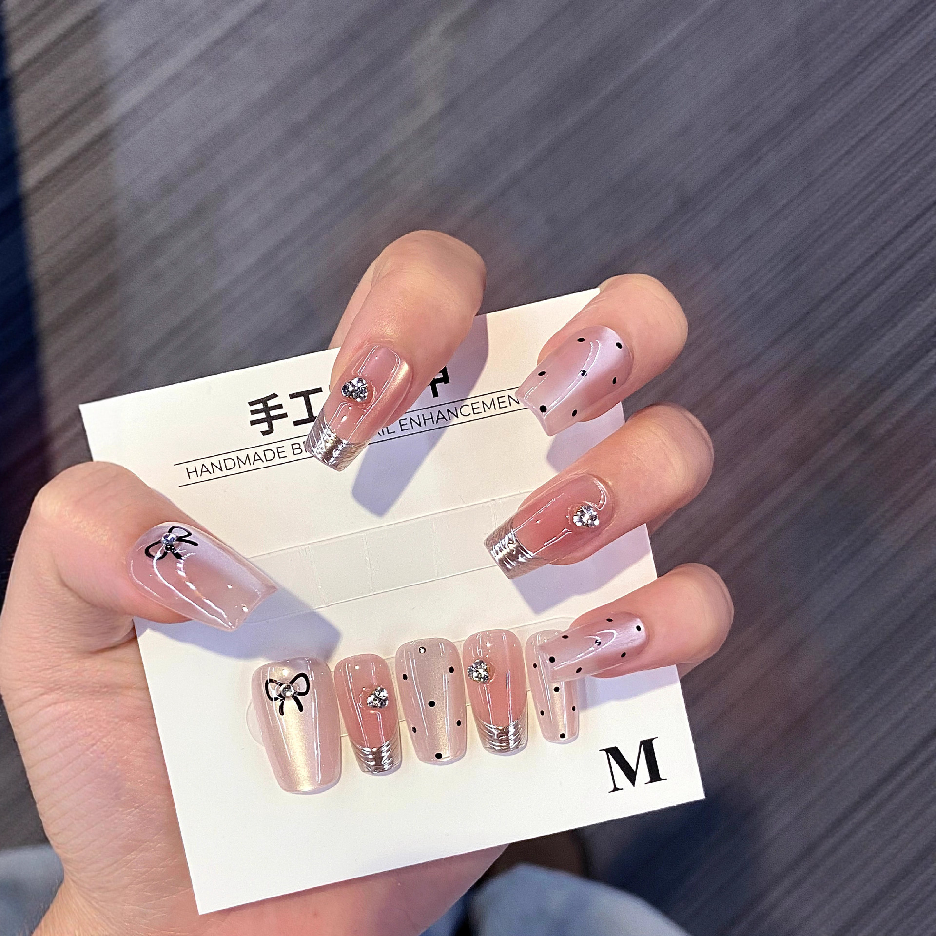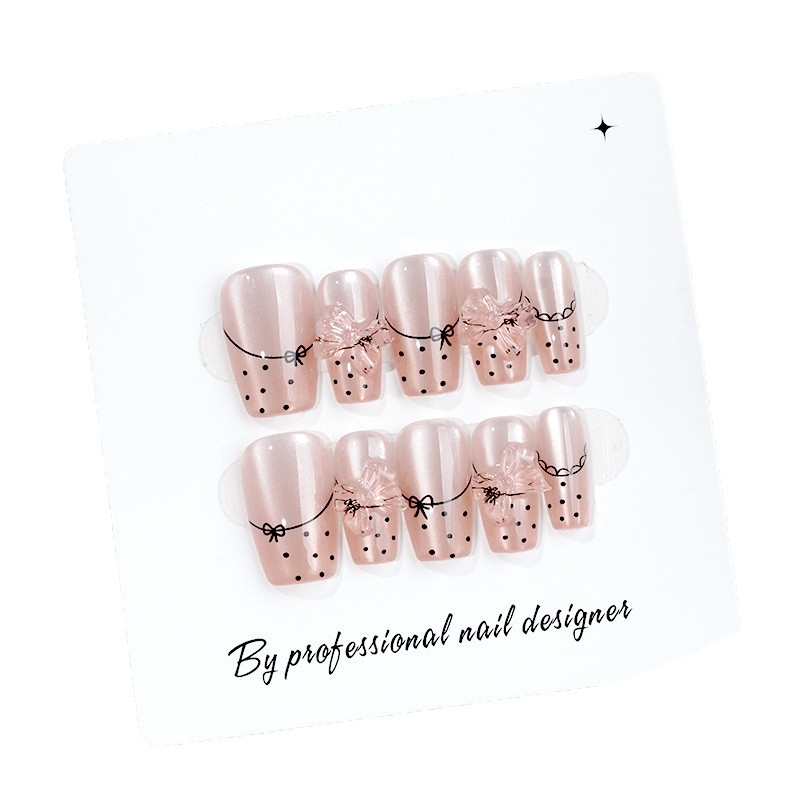 跨境热销欧美手工美甲甲片高级感长款纯色蝴蝶结美拉德色系穿戴甲