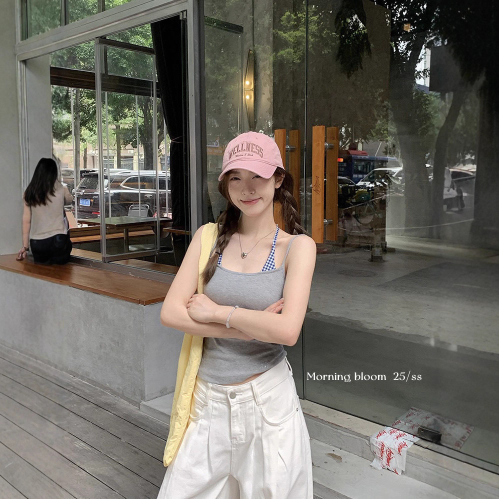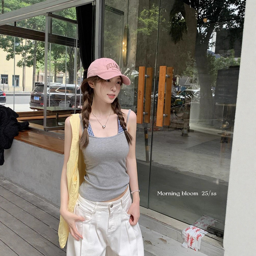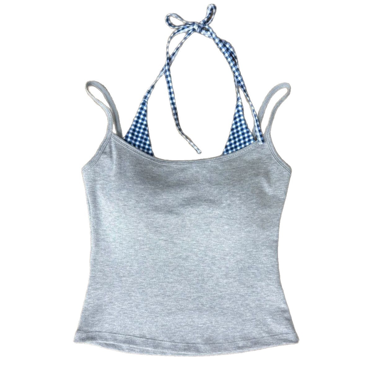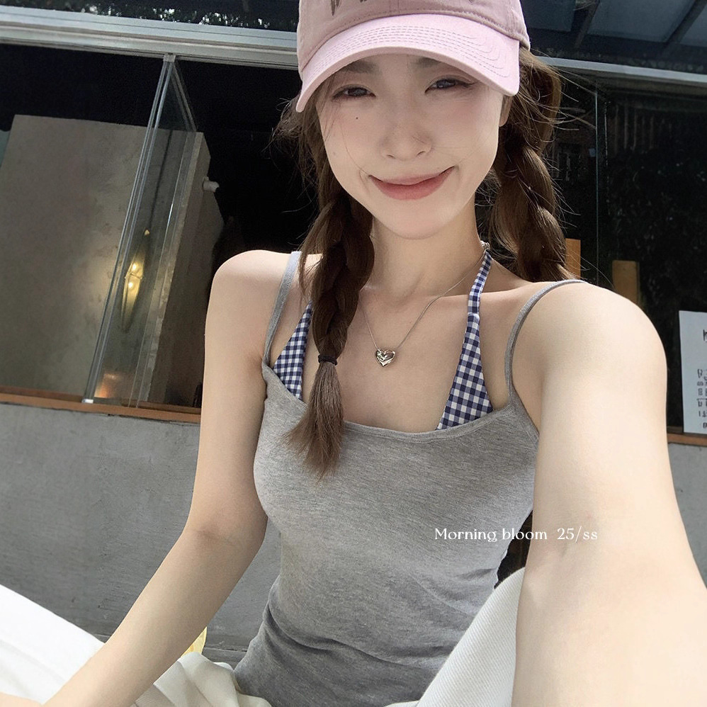 纯欲风挂脖假两件吊带美背格纹绑带设计带胸垫辣妹修身无袖上衣女