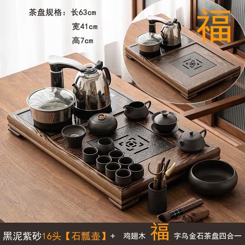 | 颜色 | 黑泥19头【石瓢壶+壶承】+鸡翅木【福】茶盘四合一 | 颜色 | 黑泥紫砂16头【石瓢壶+圆茶盘】 |