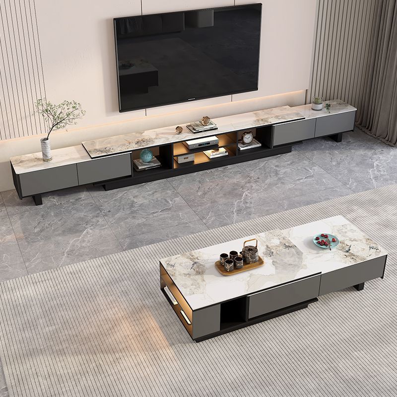 | 颜色 | 奶油色伸缩电视柜【香耐儿岩板】 | 颜色 | 灰色伸缩电视柜+茶几组合【灰亮光岩板】 |