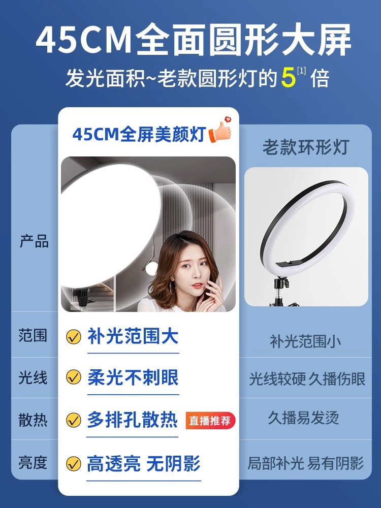 颜色 | 【68000Lm旗舰增亮款】全面大屏补光灯+落地俯拍支架+双机位 | | 颜色 | 【68000Lm旗舰增亮款】全面大屏补光灯顶灯+落地支架 |