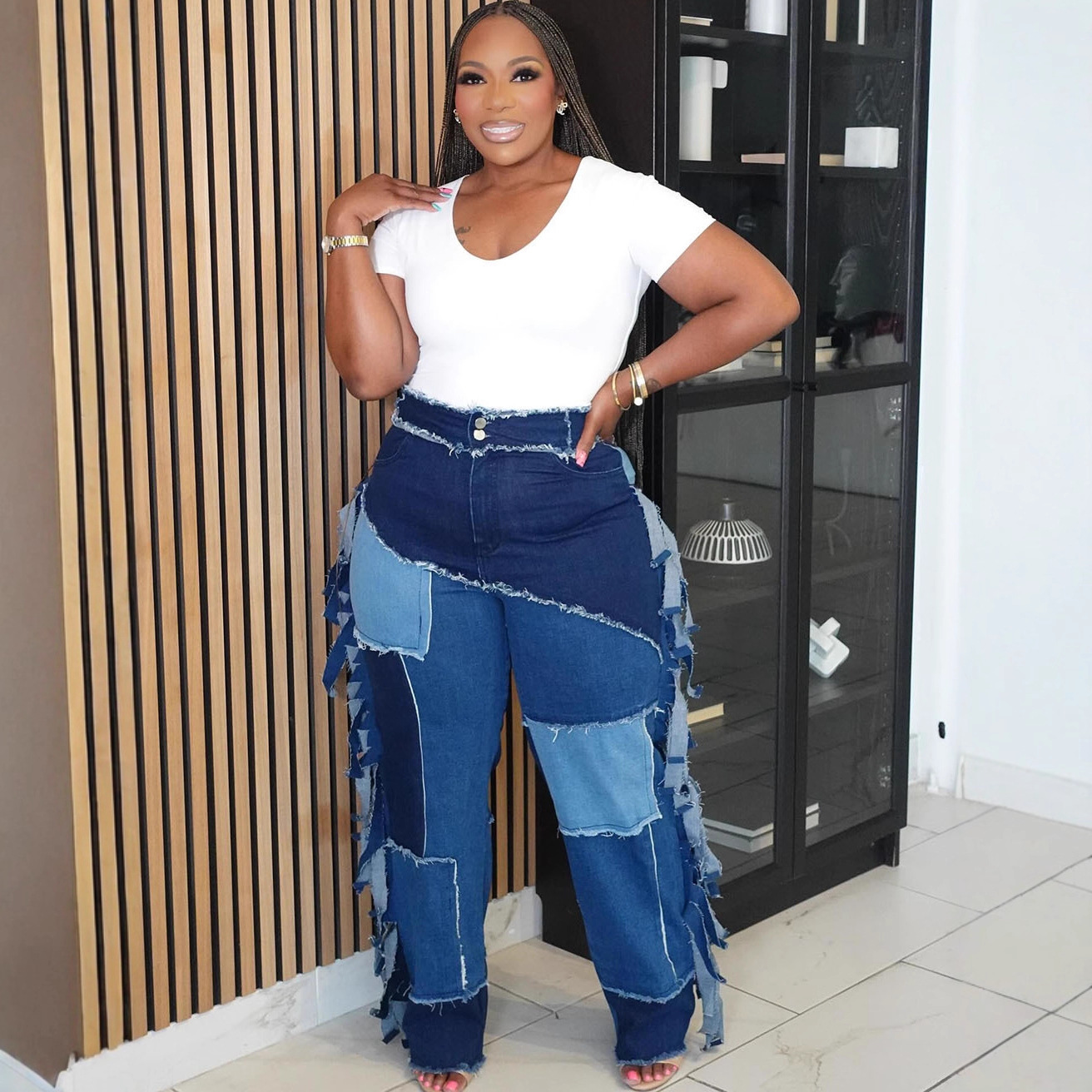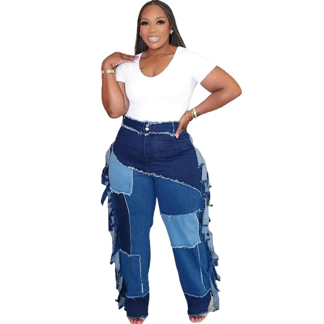 新款拼接牛仔裤 欧美女式休闲裤 亚马逊跨境女装水洗拼色流苏长裤