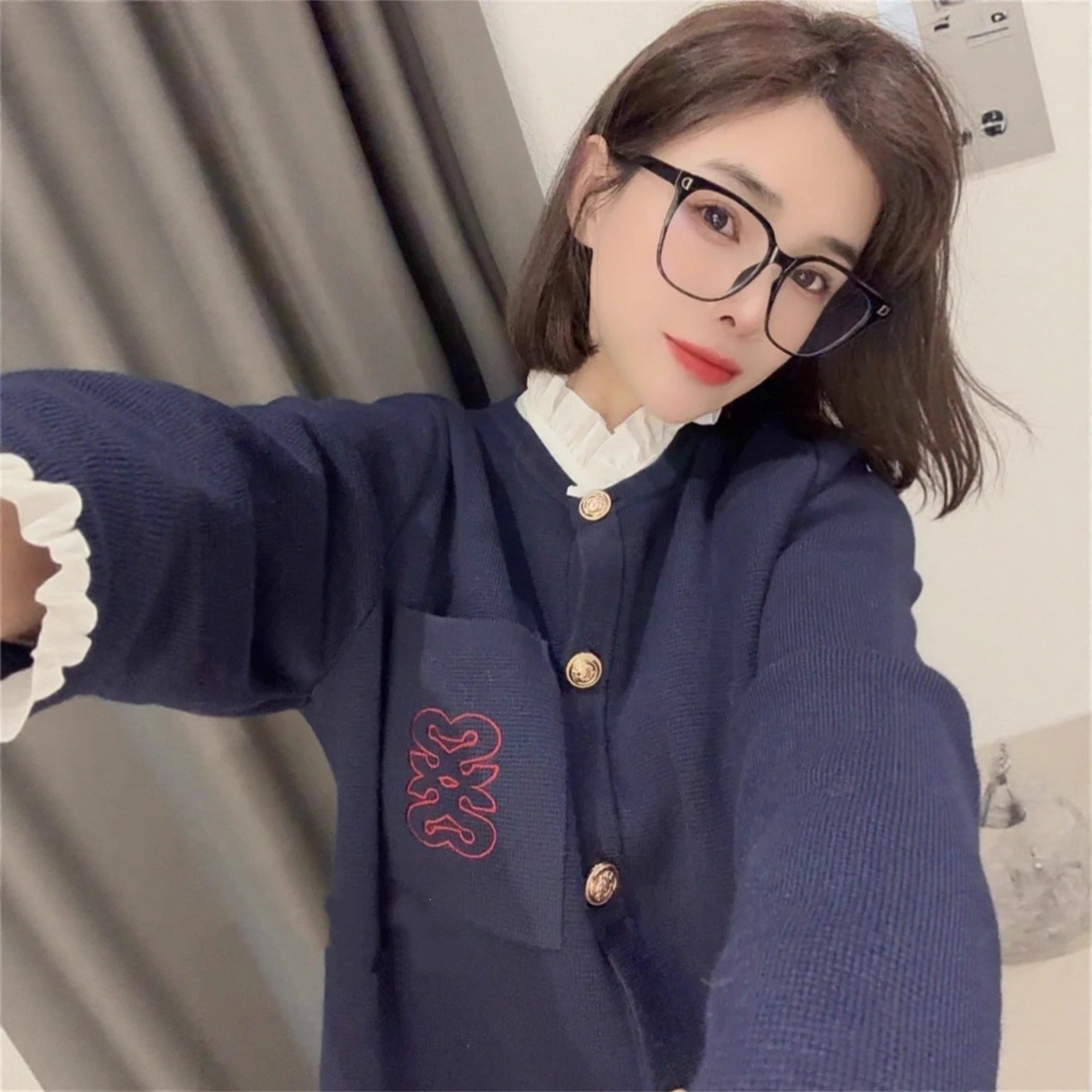 一件代发法单S家修身荷叶边木耳边可拆卸领刺绣针织长袖开衫外套