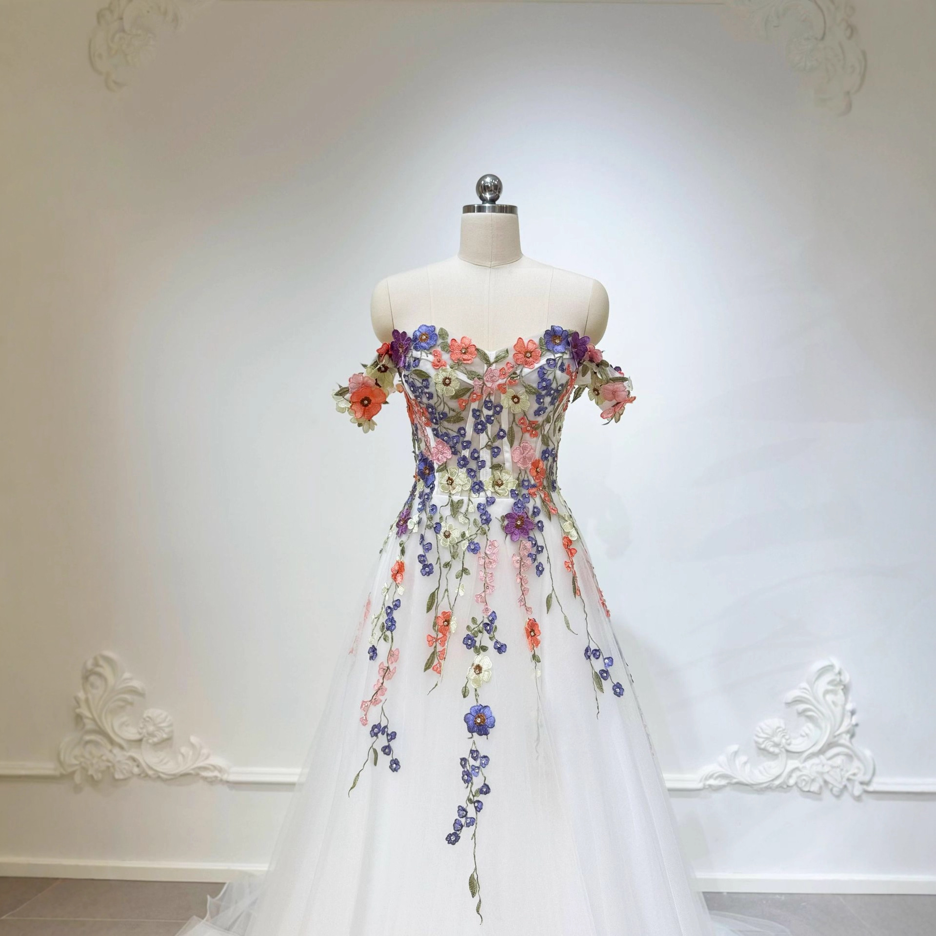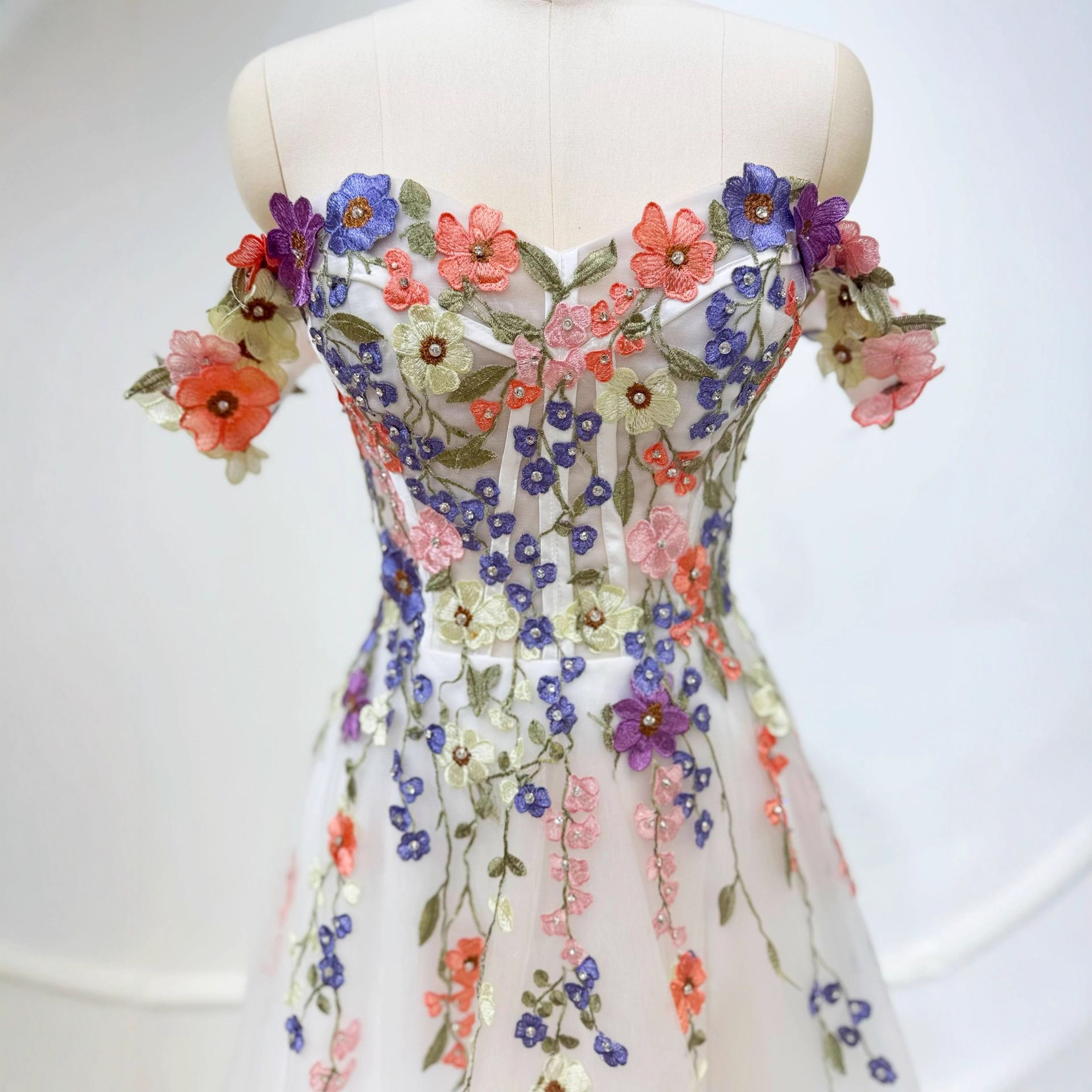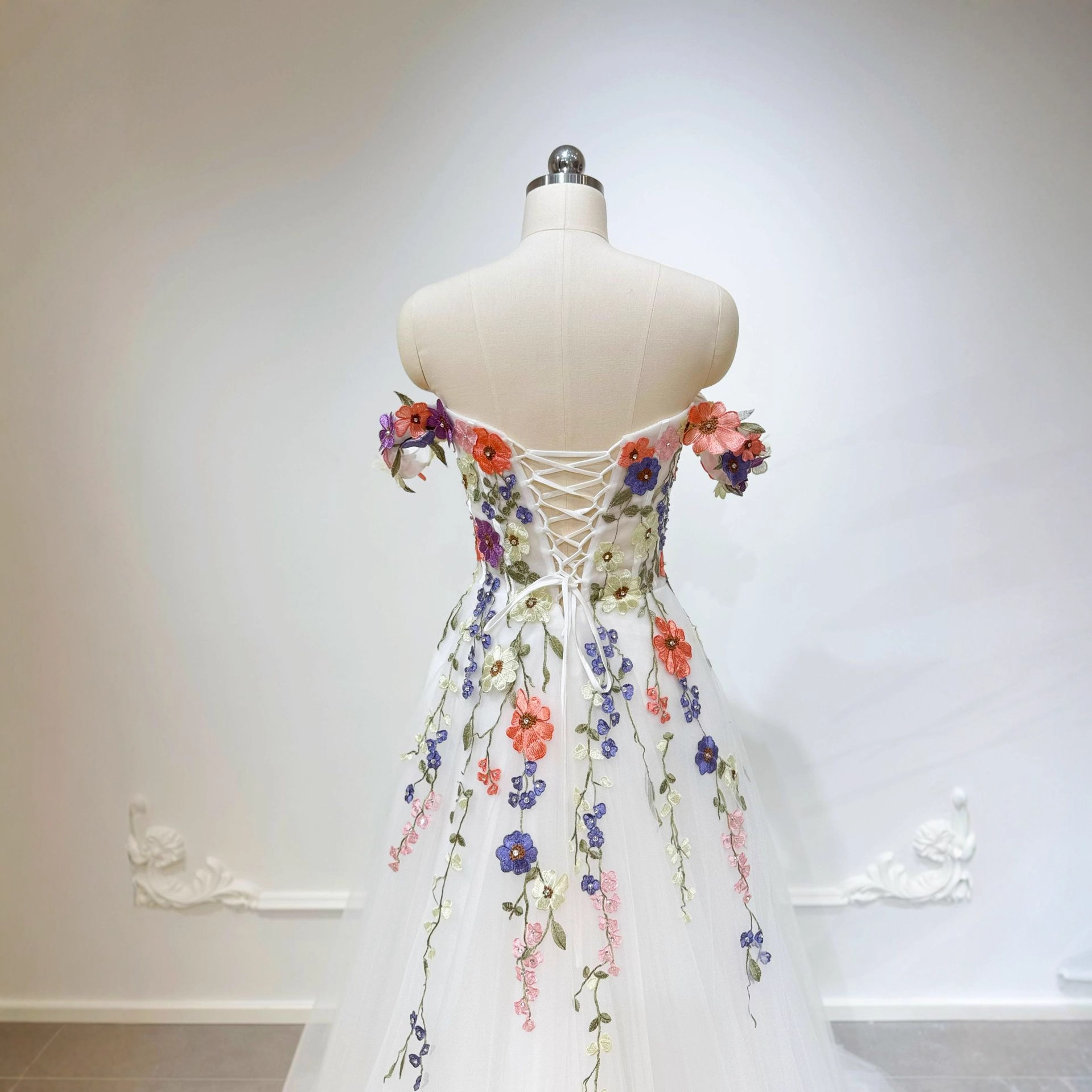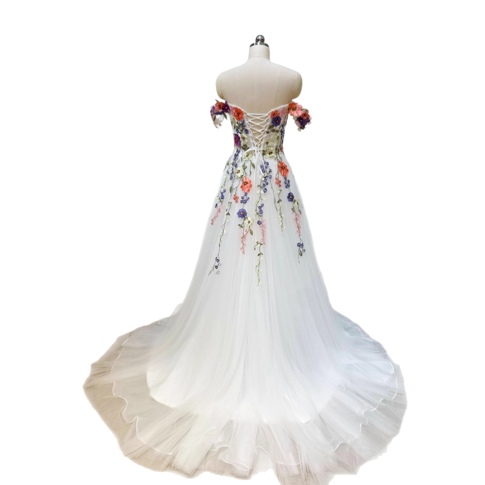 森系轻婚纱一字肩网纱彩色绣花晚礼服订婚成人礼艺考毕业主持裙子