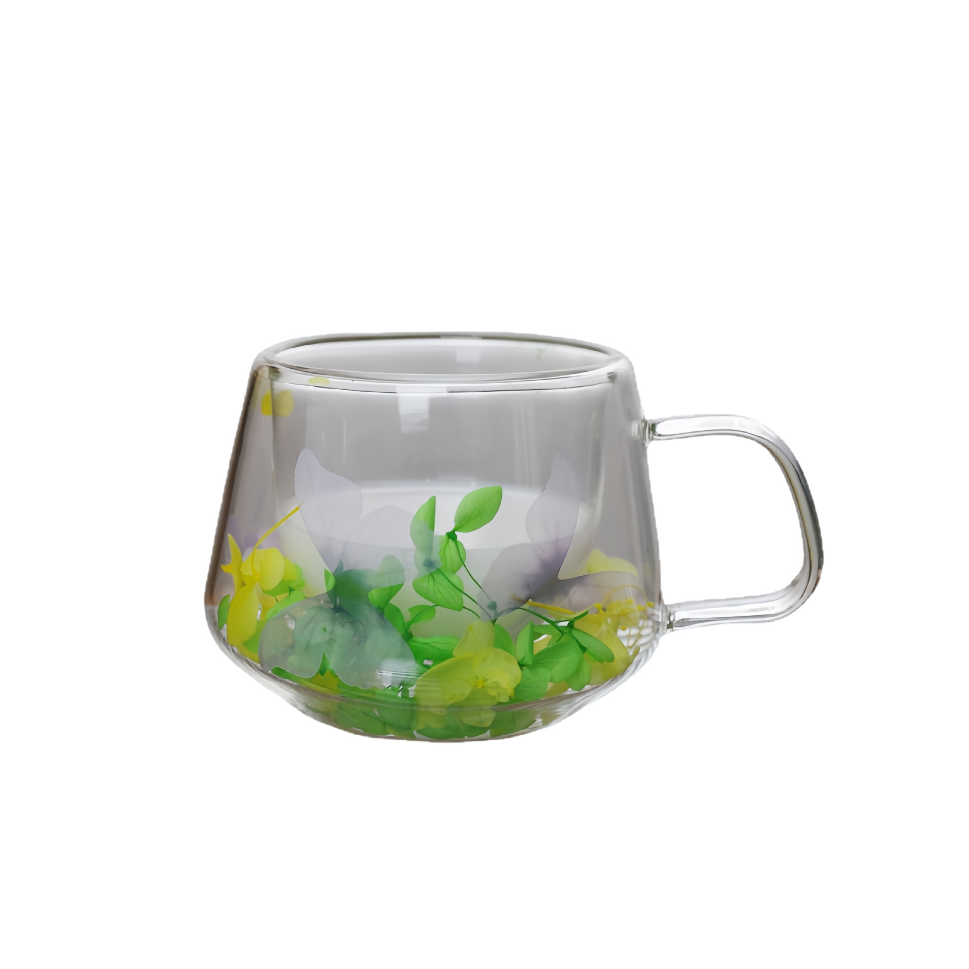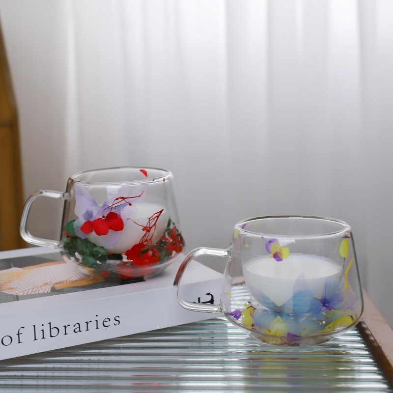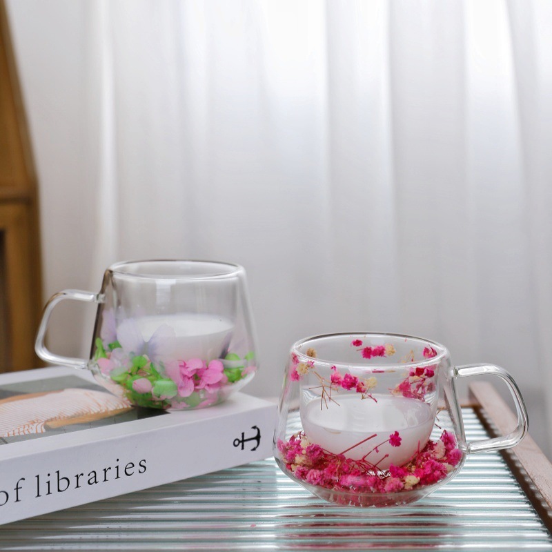 高颜值双层墩墩干花杯 简约果汁饮料牛奶杯 高硼硅玻璃花瓣造型杯