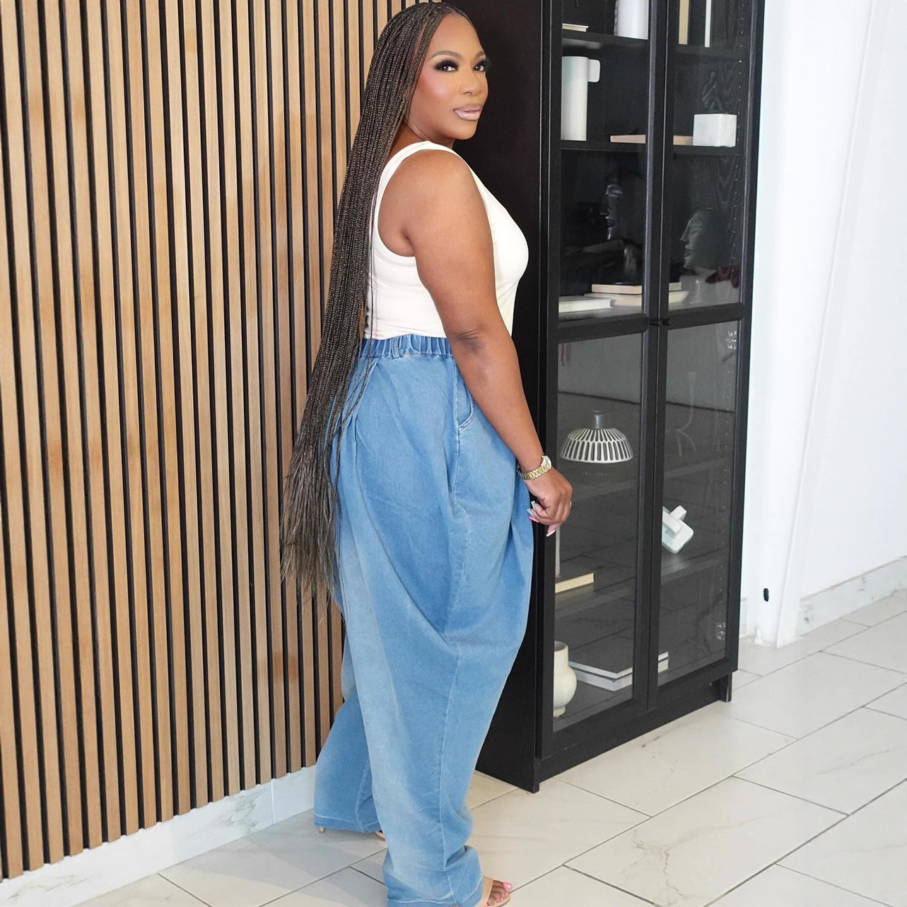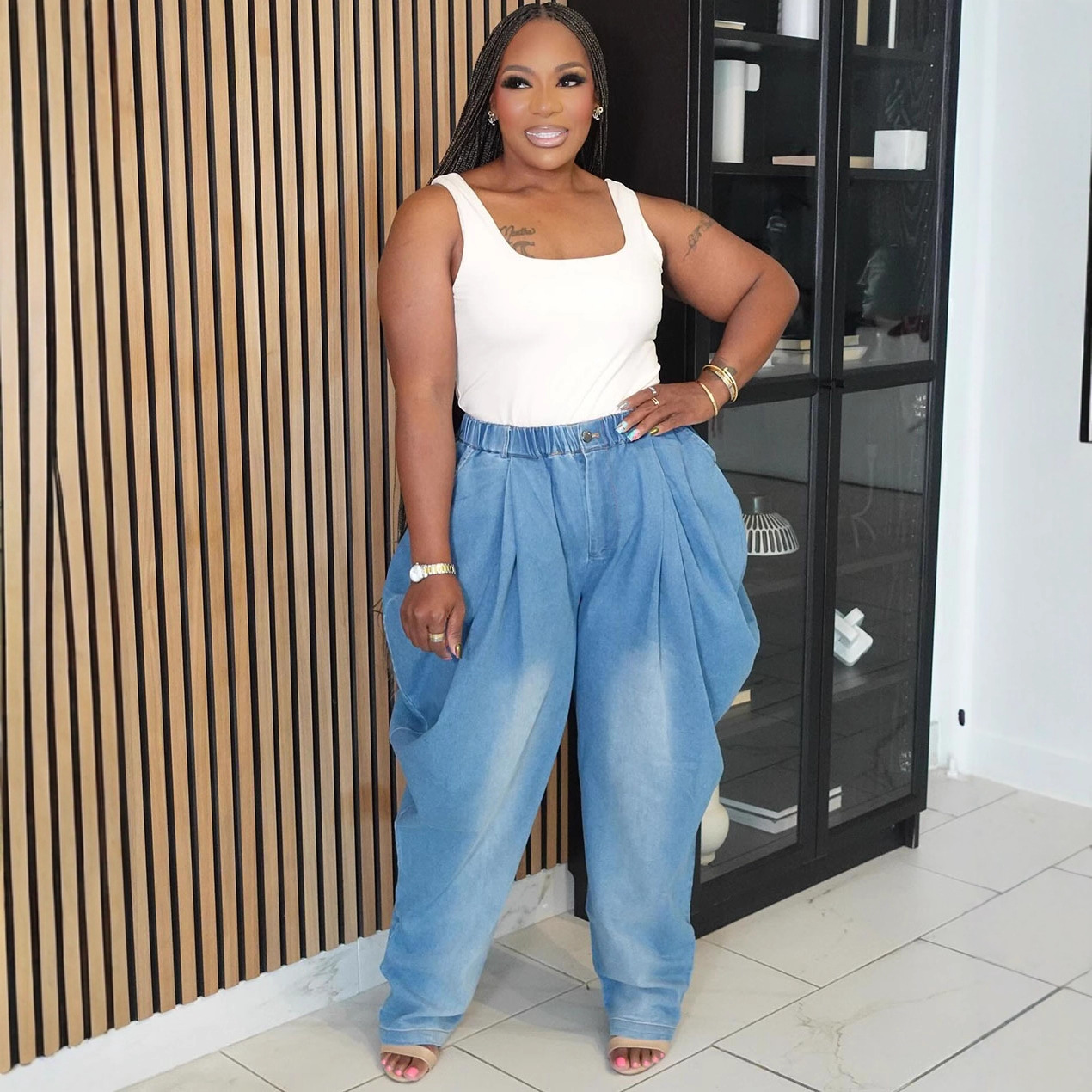 欧美女式高腰牛仔裤 亚马逊跨境女装街头休闲宽松哈伦阔腿灯笼裤