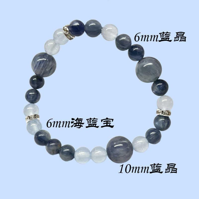| 颜色 | 10+6蓝晶石海蓝宝手串18cm | 颜色 | 15cm 雾岛诗-蓝晶石设计款手串 |