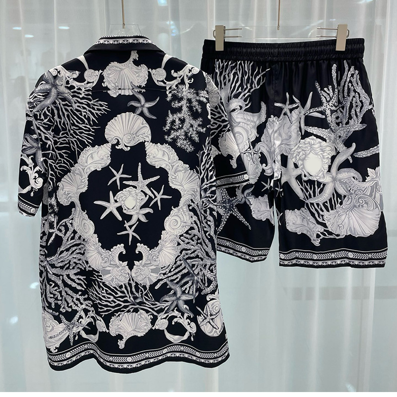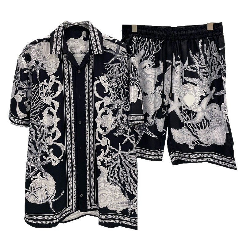 2025夏季欧美潮流外贸时尚休闲数码印花男短袖衬衣沙滩裤套装潮牌