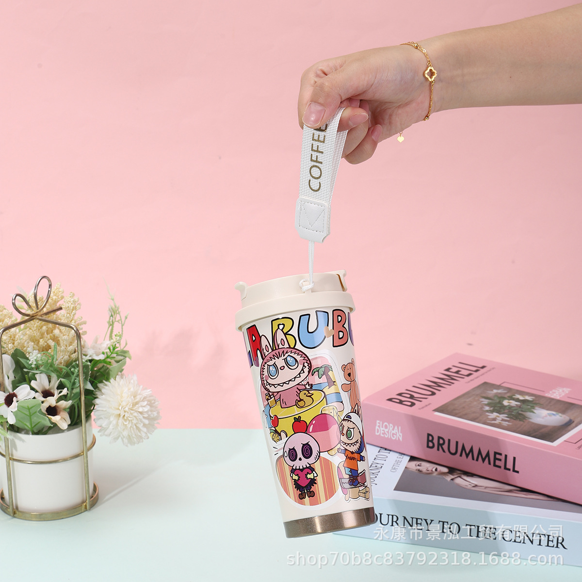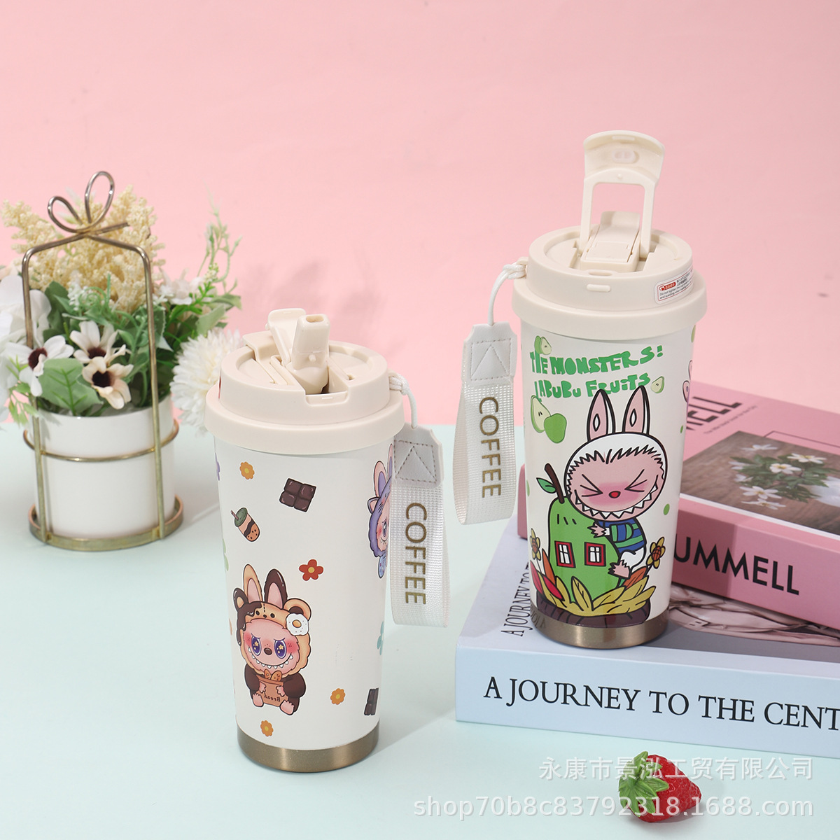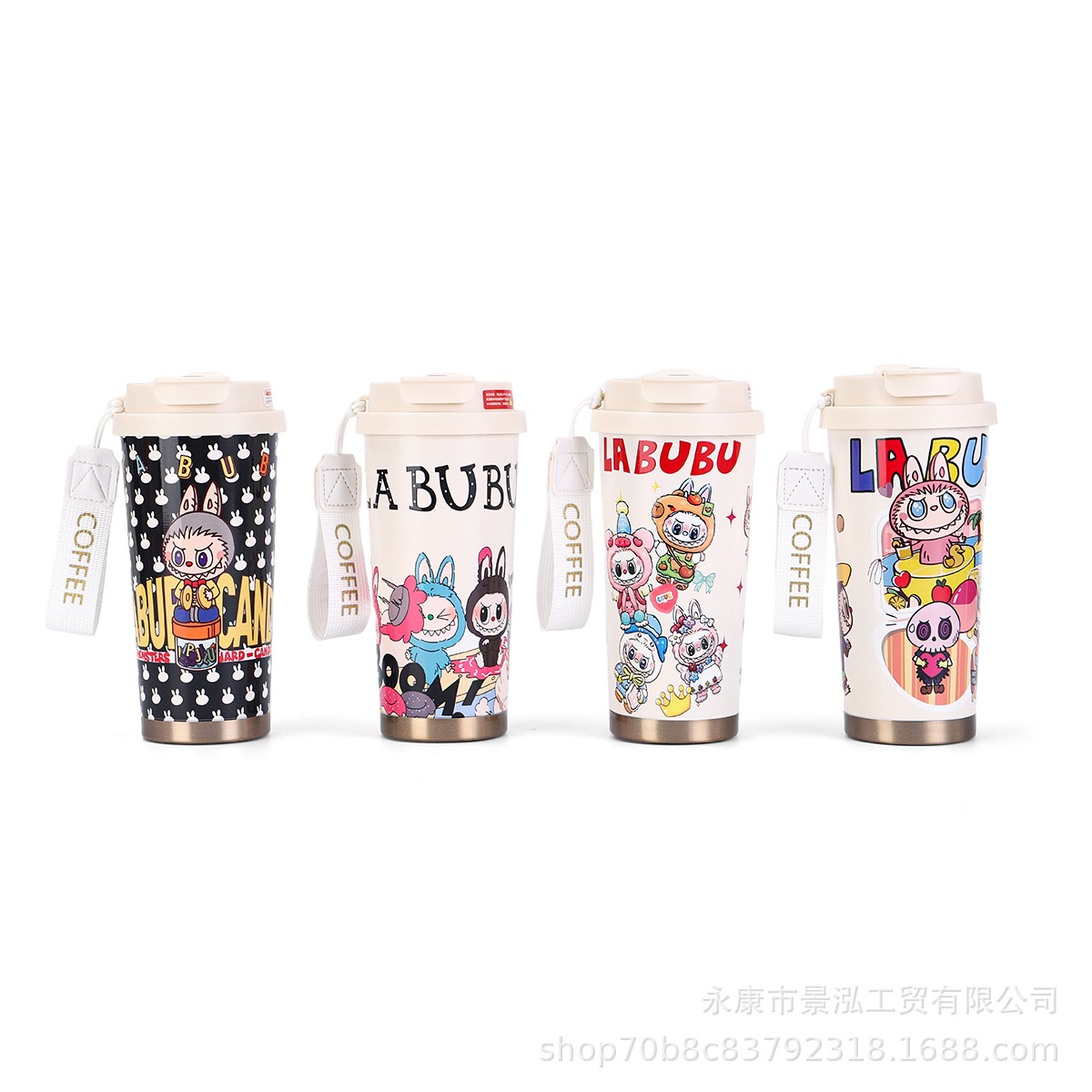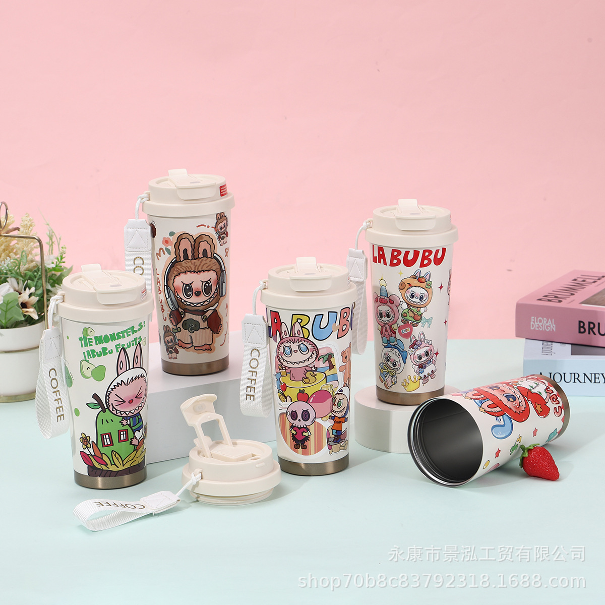 跨境新款316不锈钢保温杯高颜值拉布布图案咖啡杯便携双饮铃兰杯