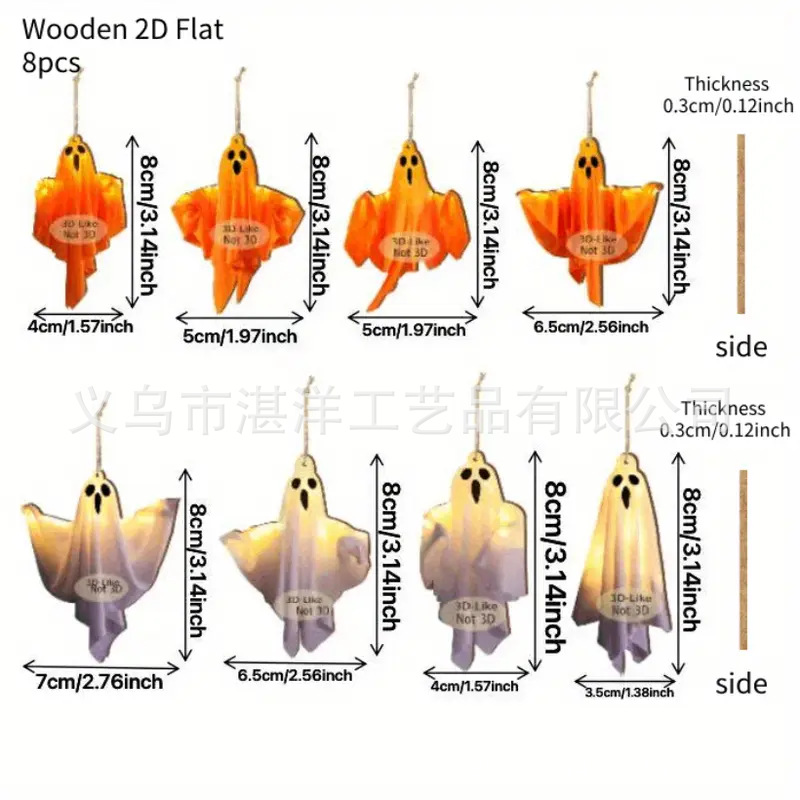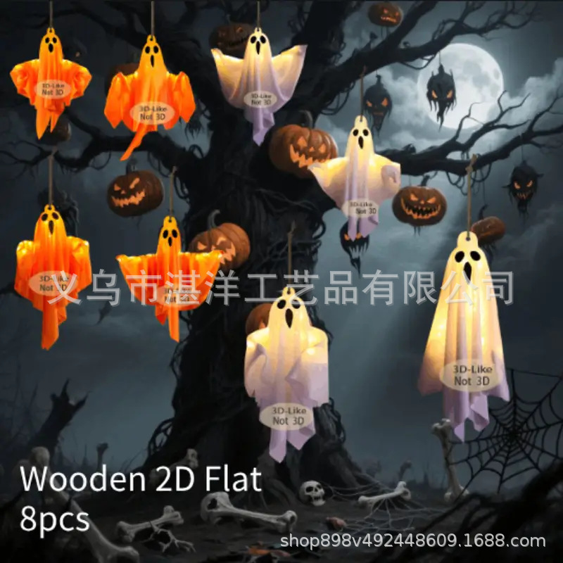 8个装木制万圣节鬼魂 2D平面搞笑白色和黄色披风鬼魂,室内树装饰