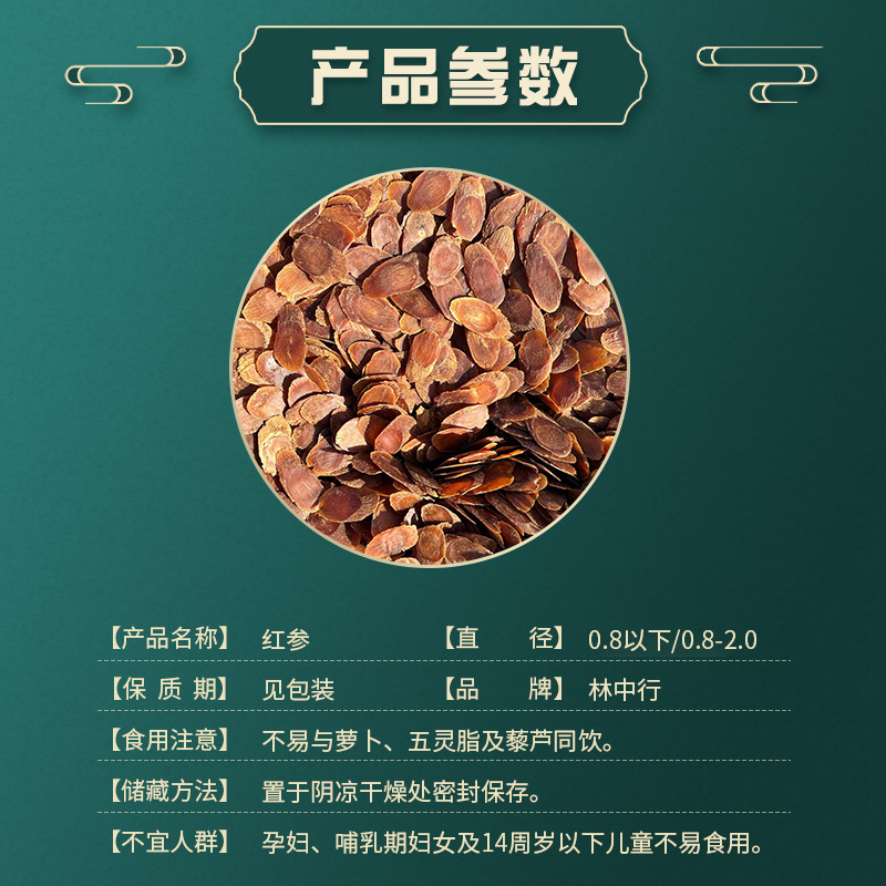 | 包装规格 | 红参片直径0.8【250g/罐】 | 包装规格 | 红参片直径1.0【250g/罐】 |